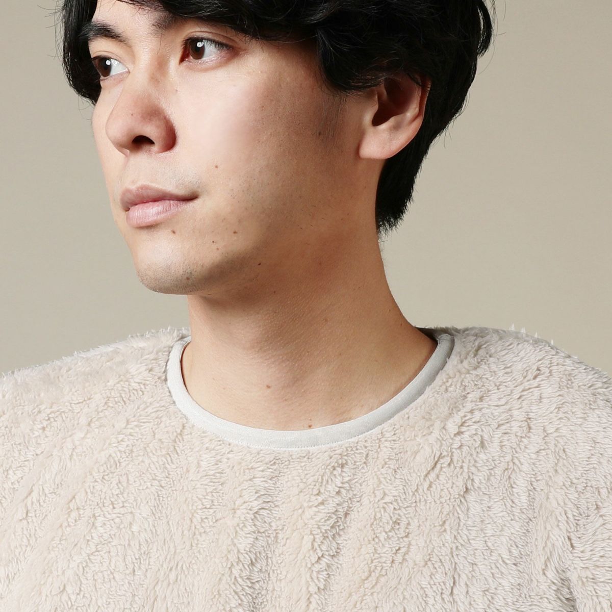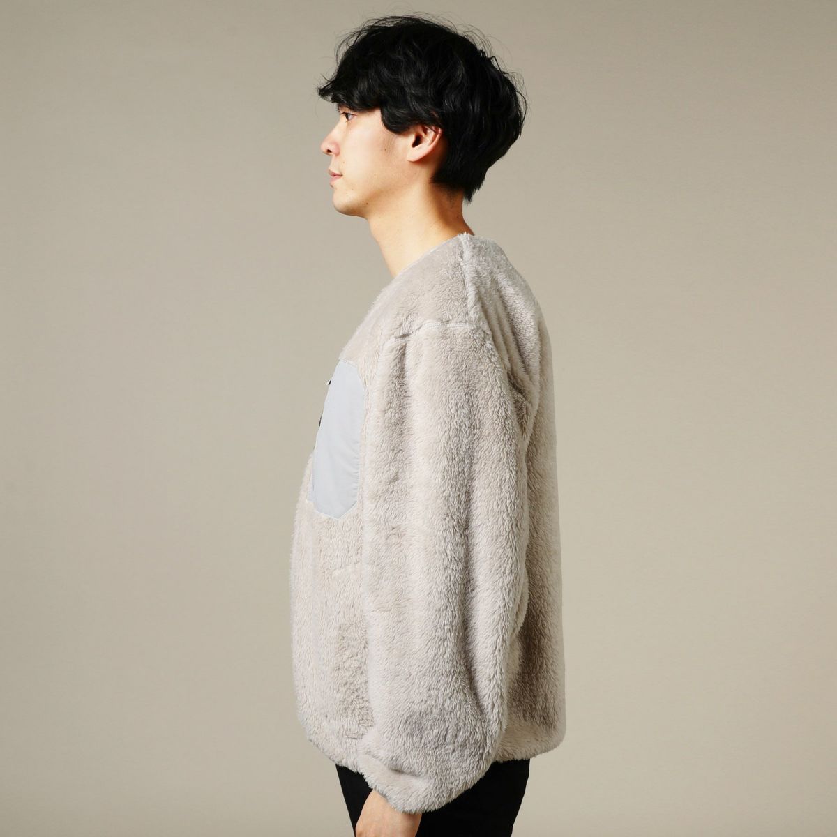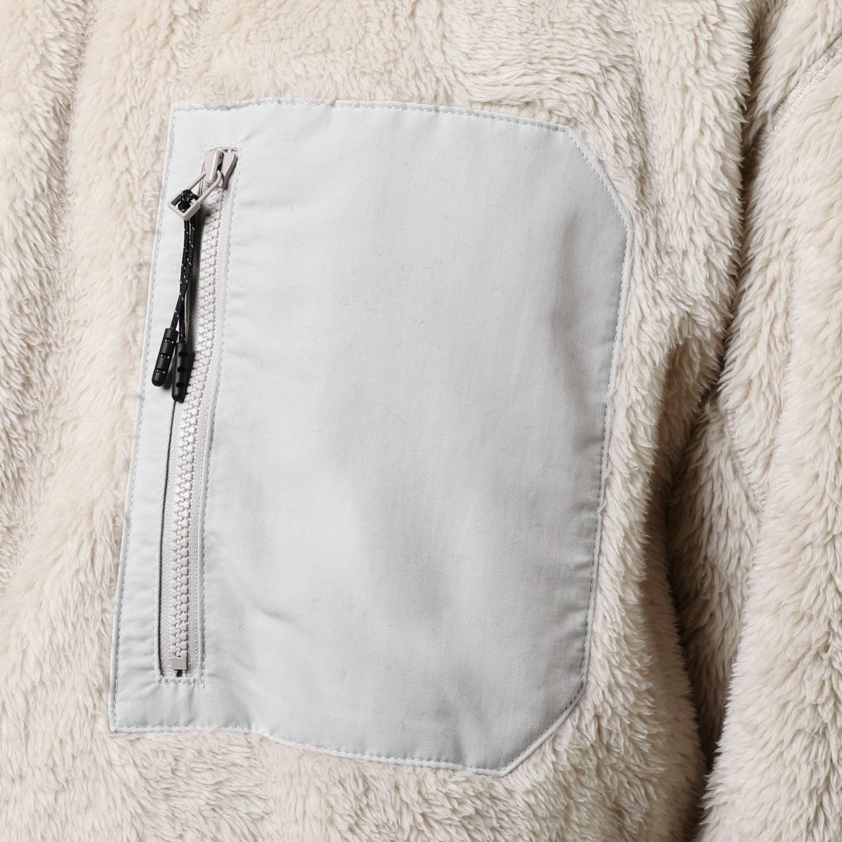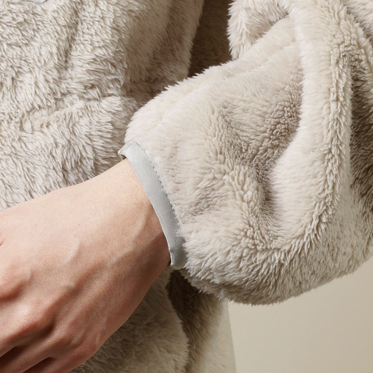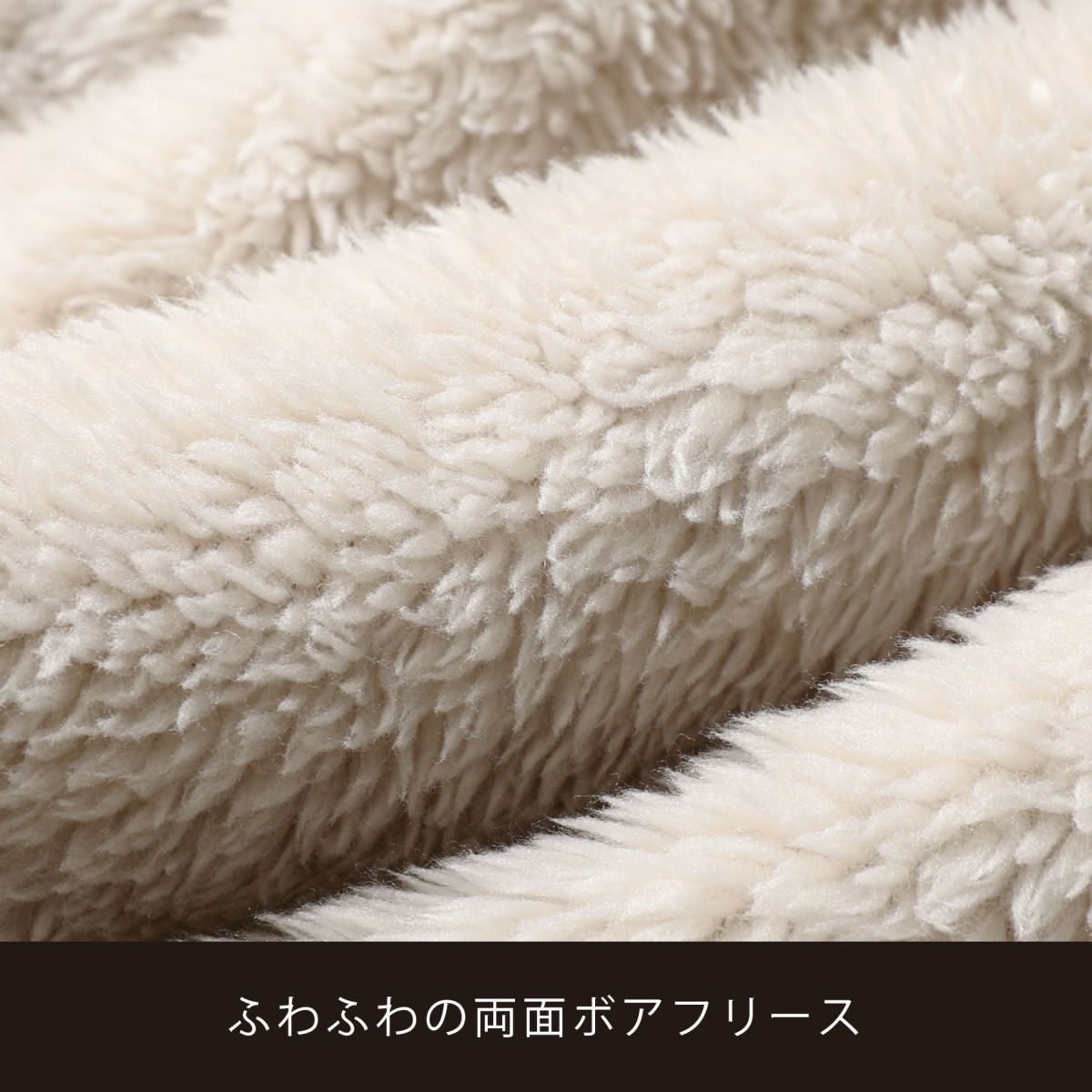ふわふわとしていて触れた瞬間ほっとするような、心地よい質感のボアフリース生地です。裏も表も同じようにボア仕上げになっているため、着用時には内側でも肌触り良く気持ちの良い着心地を実感いただけます。長時間着用していてもほとんど疲れないような、軽量な生地です。