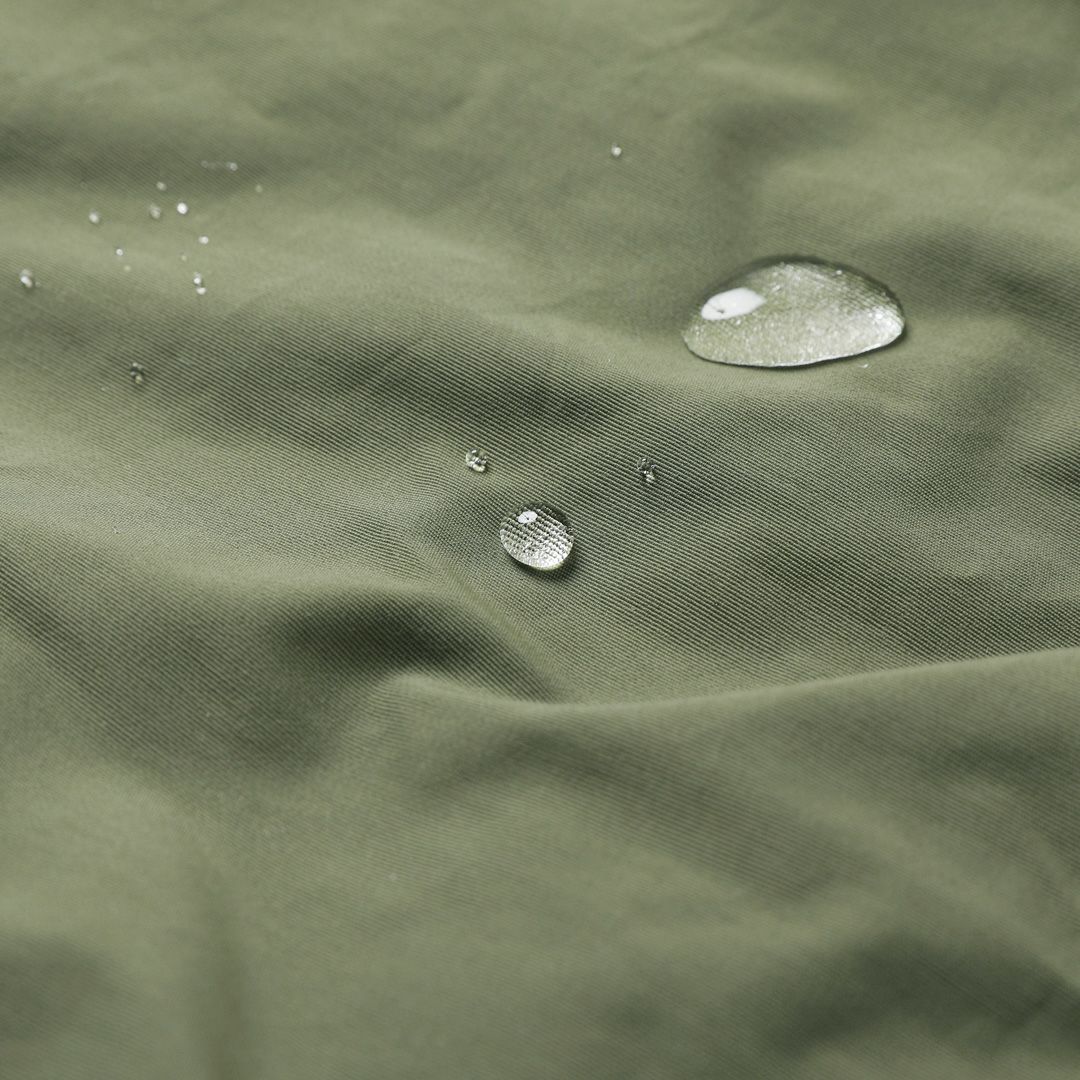雨や雪といった悪天候時には、6割のコットンが膨張することで生地の隙間を埋めることで生地全体の密度が増し、4割のナイロンの性質上、水を弾き、風をシャットアウト。撥水性と防風性を備える機能素材となります。