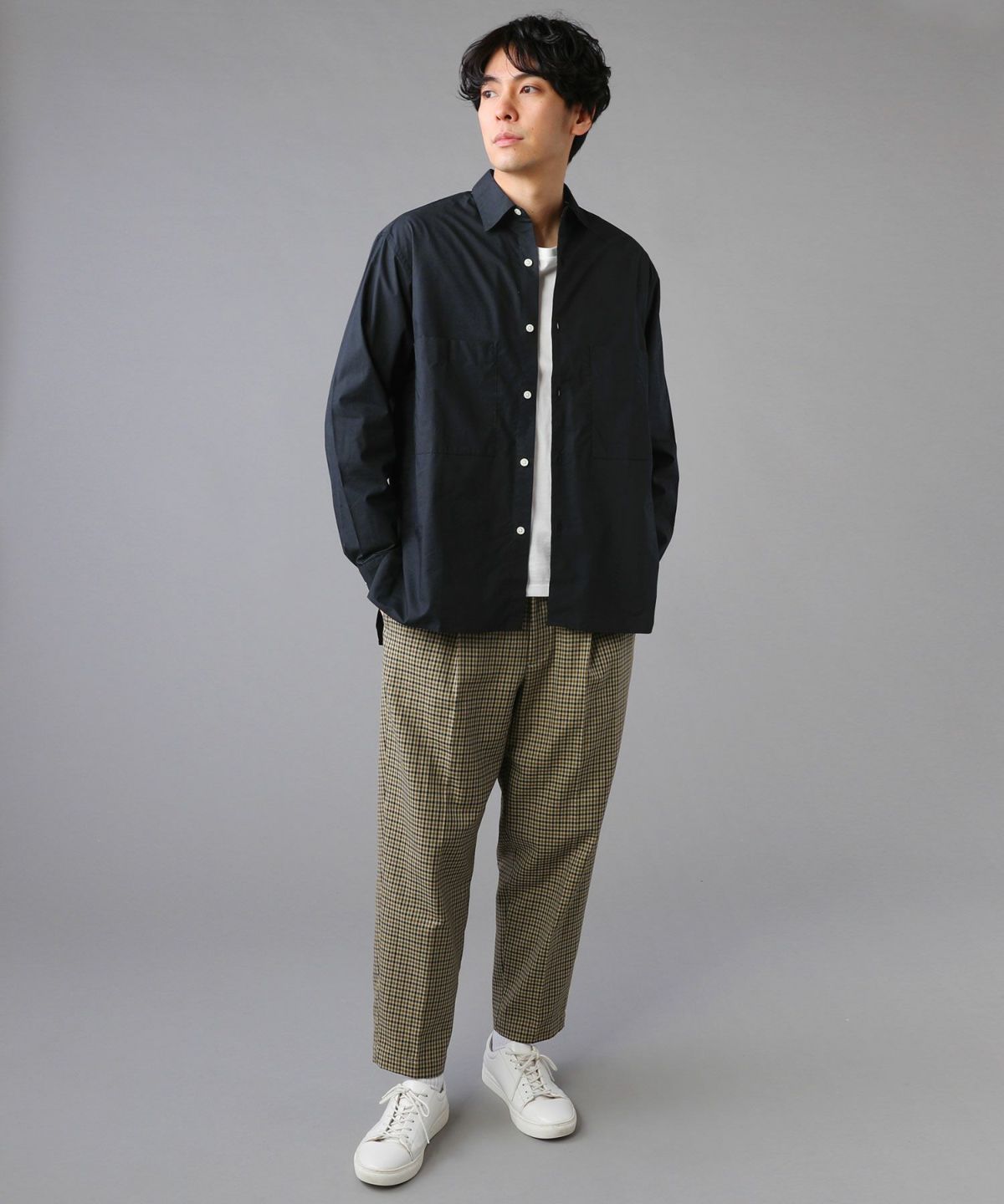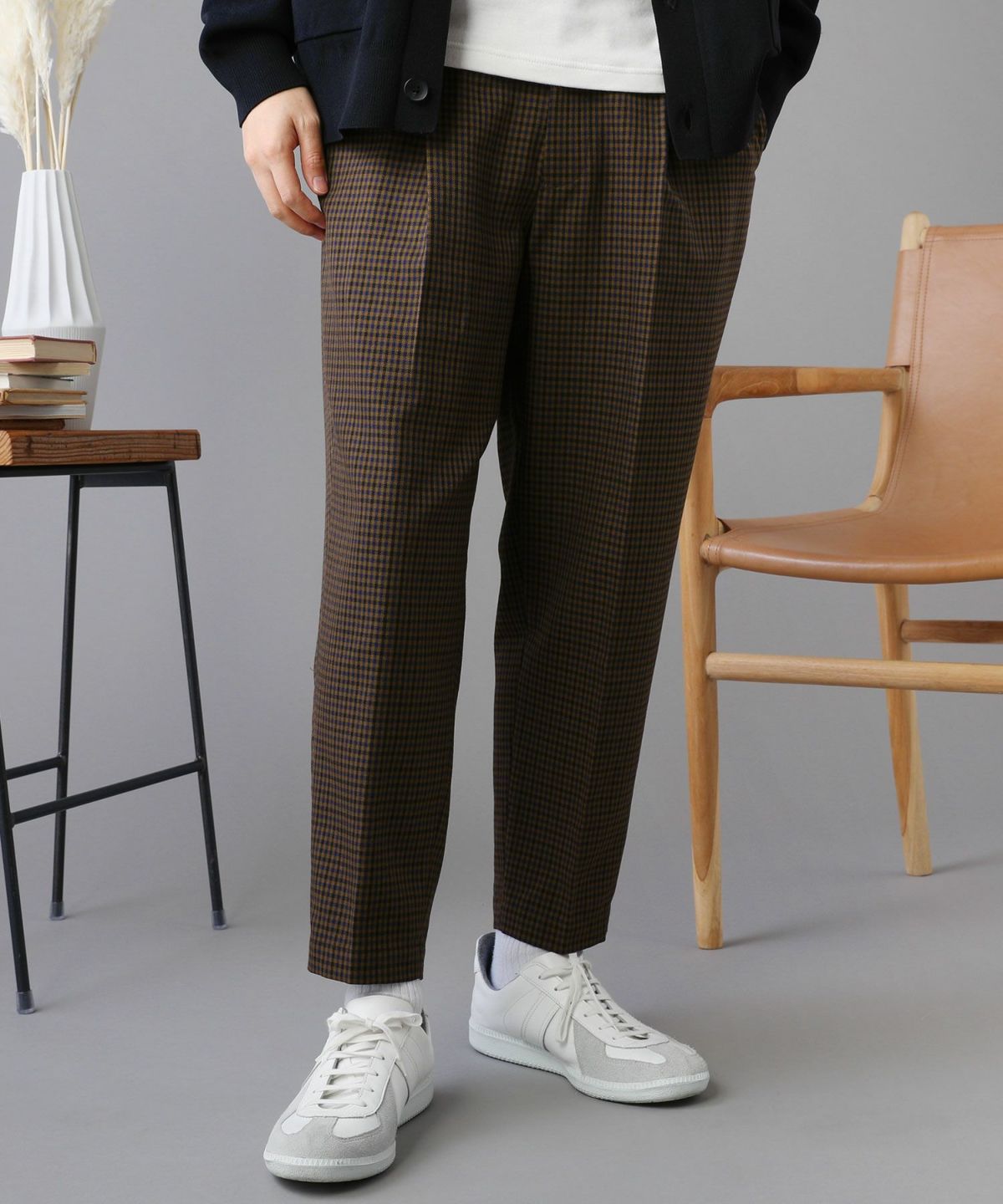 足元をスッキリと見せる、アンクル丈のスラックスパンツです。クラシカルなガンクラブチェックが印象的で、柄のサイズも小さく上品な雰囲気。裾にかけて入ったテーパードラインが美しく、ゆとりのあるワイドな作りながら、シルエットにもたつき感がありません。ウエスト後ろがゴム仕様で生地も柔らかいため、リラックスした穿き心地のアイテムです。