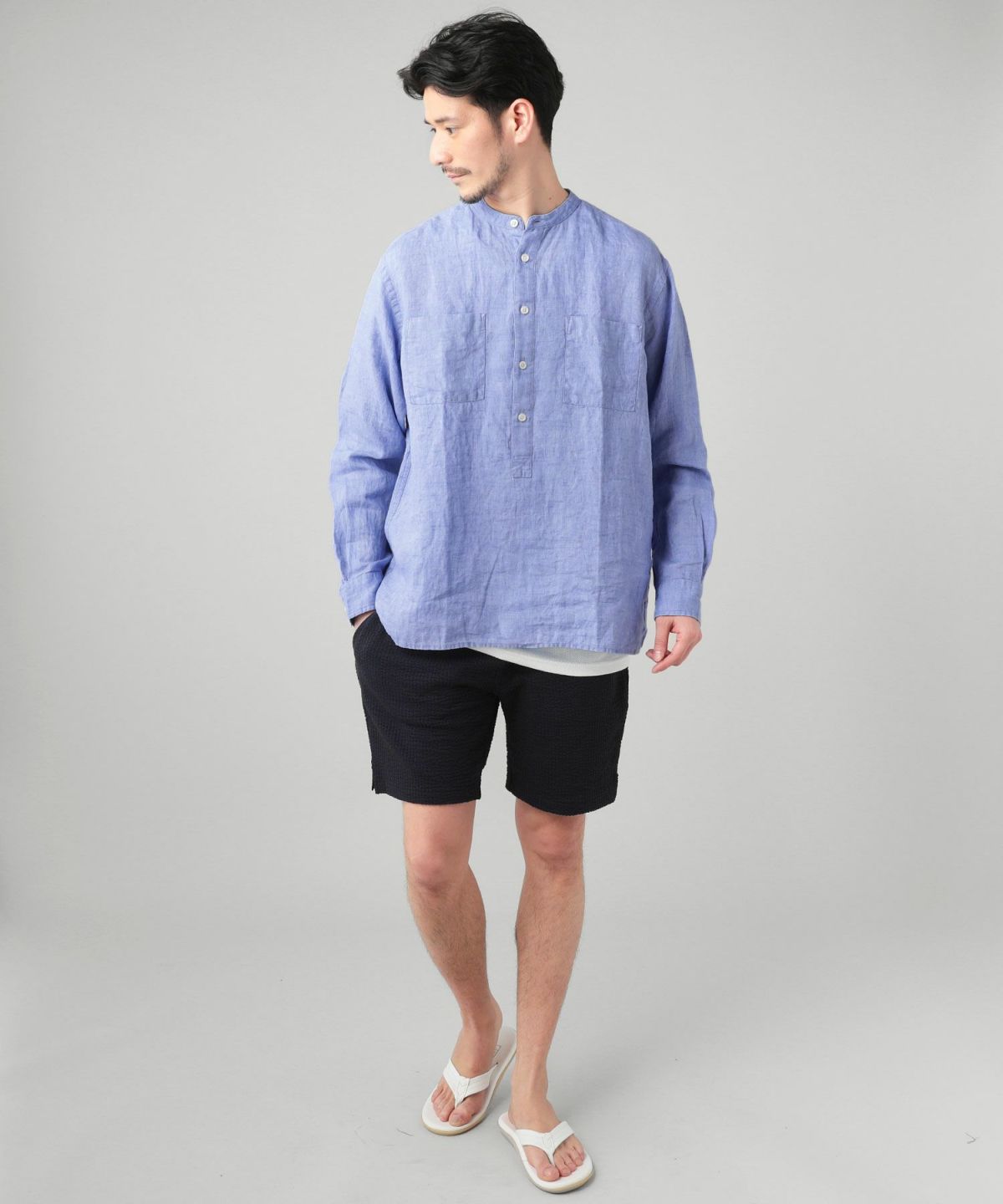 ●抜け感のある襟元が魅力のバンドカラーシャツ
