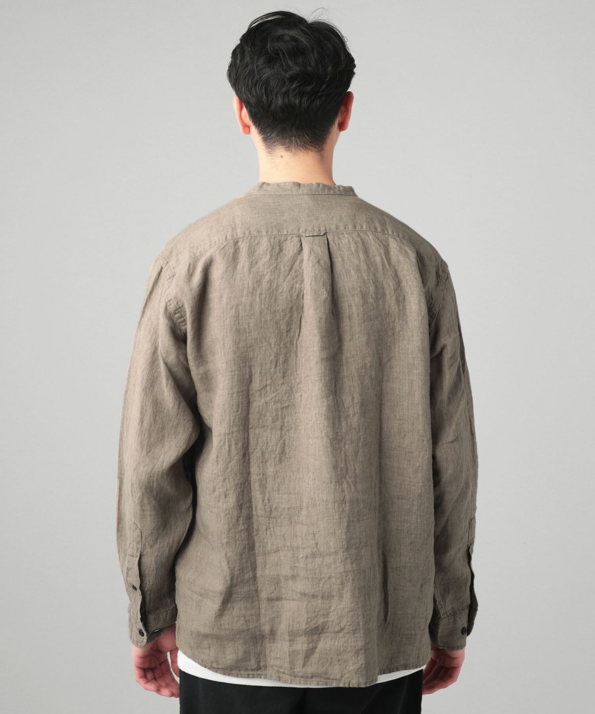 立ち襟のようなバンドを首に一周させたデザインが特徴のバンドカラーシャツは、トレンドの旬アイテム。「ミストダイ」と呼ばれる方法で染色された麻素材を使用しており、薄手で軽やかな生地感のため、汗ばむ季節も涼しく着用できるアイテムです。