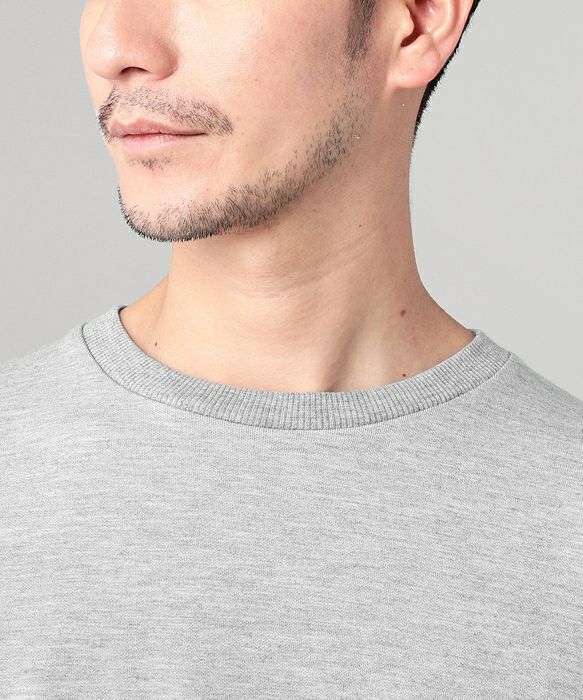 綿とポリエステルで編むダンボールニット生地を採用。冬場に着るニットではなく、「編んだ生地」という意味のニットですので肌触りはさらりとなめらか。生地構造がダンボールに似ていることからこの名前が付いた、注目度上昇中の素材です。中糸の間に空気を溜めることができるので保温性に優れ、程よい伸縮性も備えているので快適な着心地。一般的なスウェット類と比べると凹凸のないクリアな生地表面で、ハリやほのかな光沢感もあるので、より上品な印象を与えてくれます。