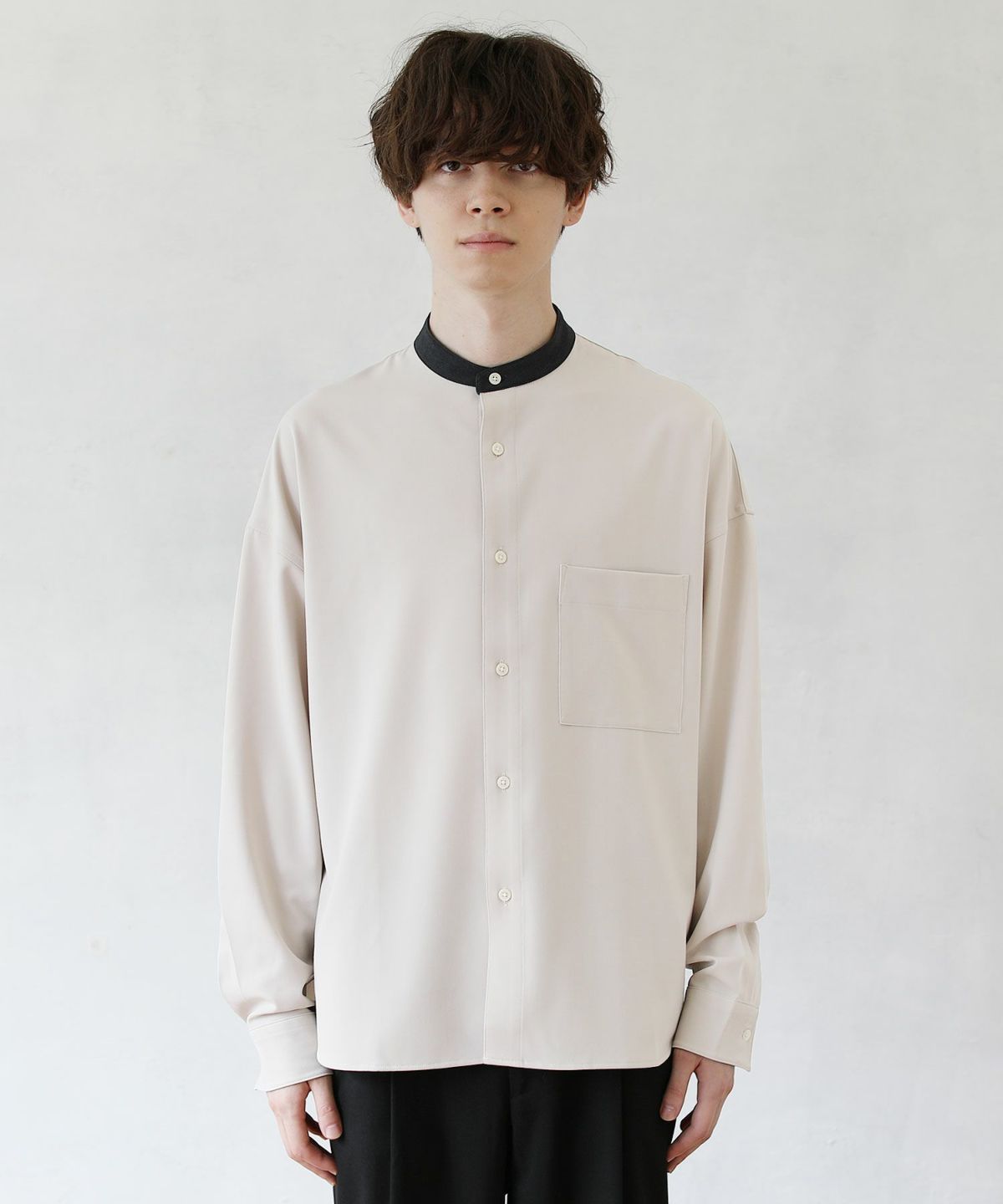 クレリック襟がアクセントになったドロップショルダーのバンドカラーシャツ。