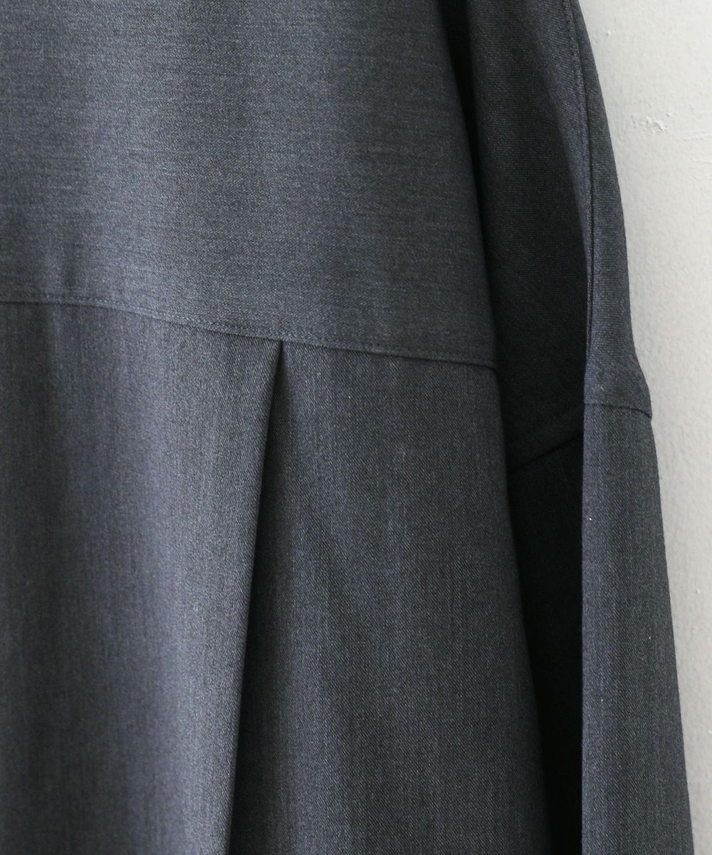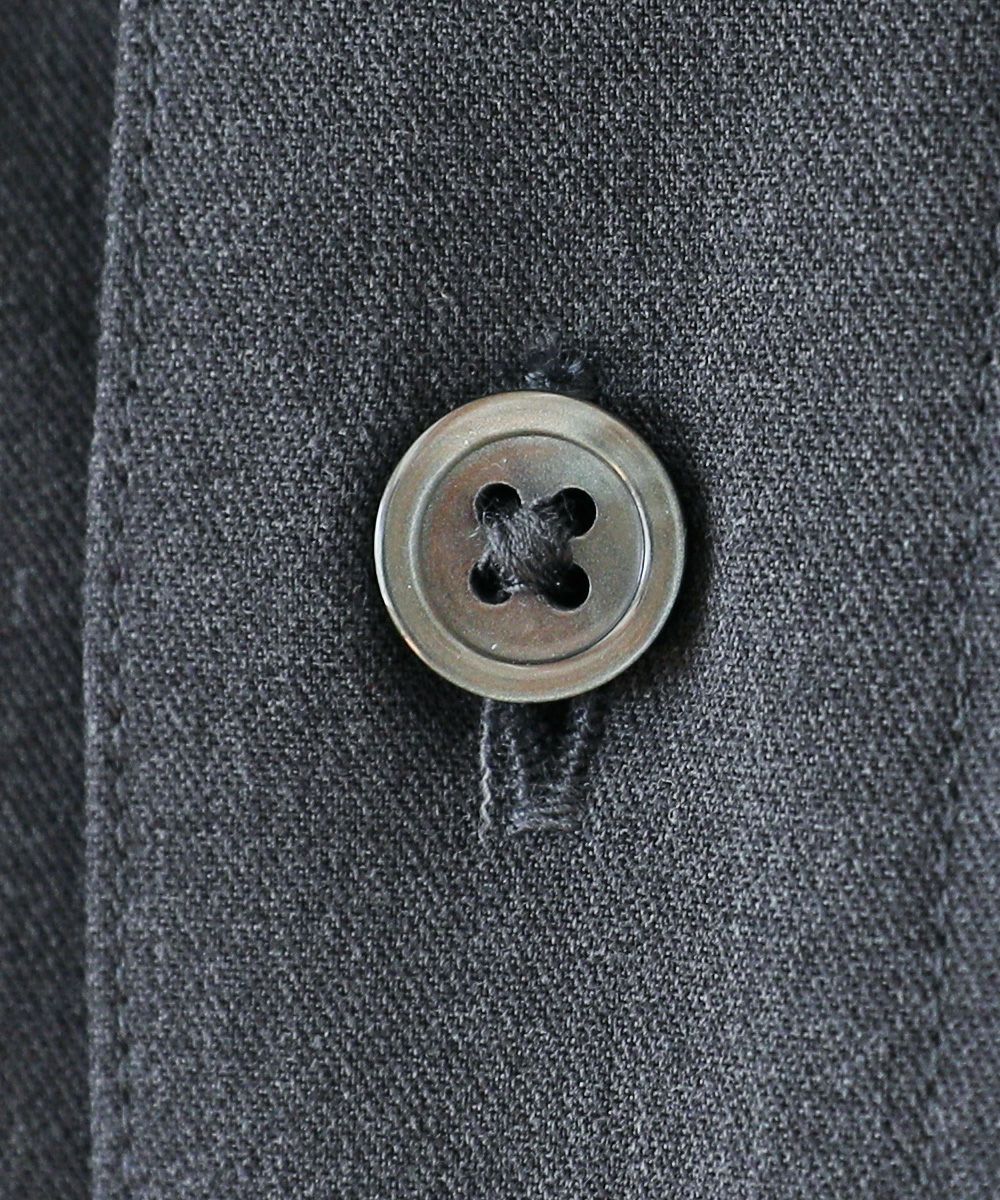 ストレッチ性があり、適度なハリ感と落ち感を両立させたポリエステルレーヨンのツイル生地を採用。しなやかで柔らかい肌触りのこの生地が、品のある落ち着いた雰囲気を演出します。素材感を活かすように削ぎ落されたミニマルなデザインで、台襟とカフス裏にはアクセントになる配色を施しました。
