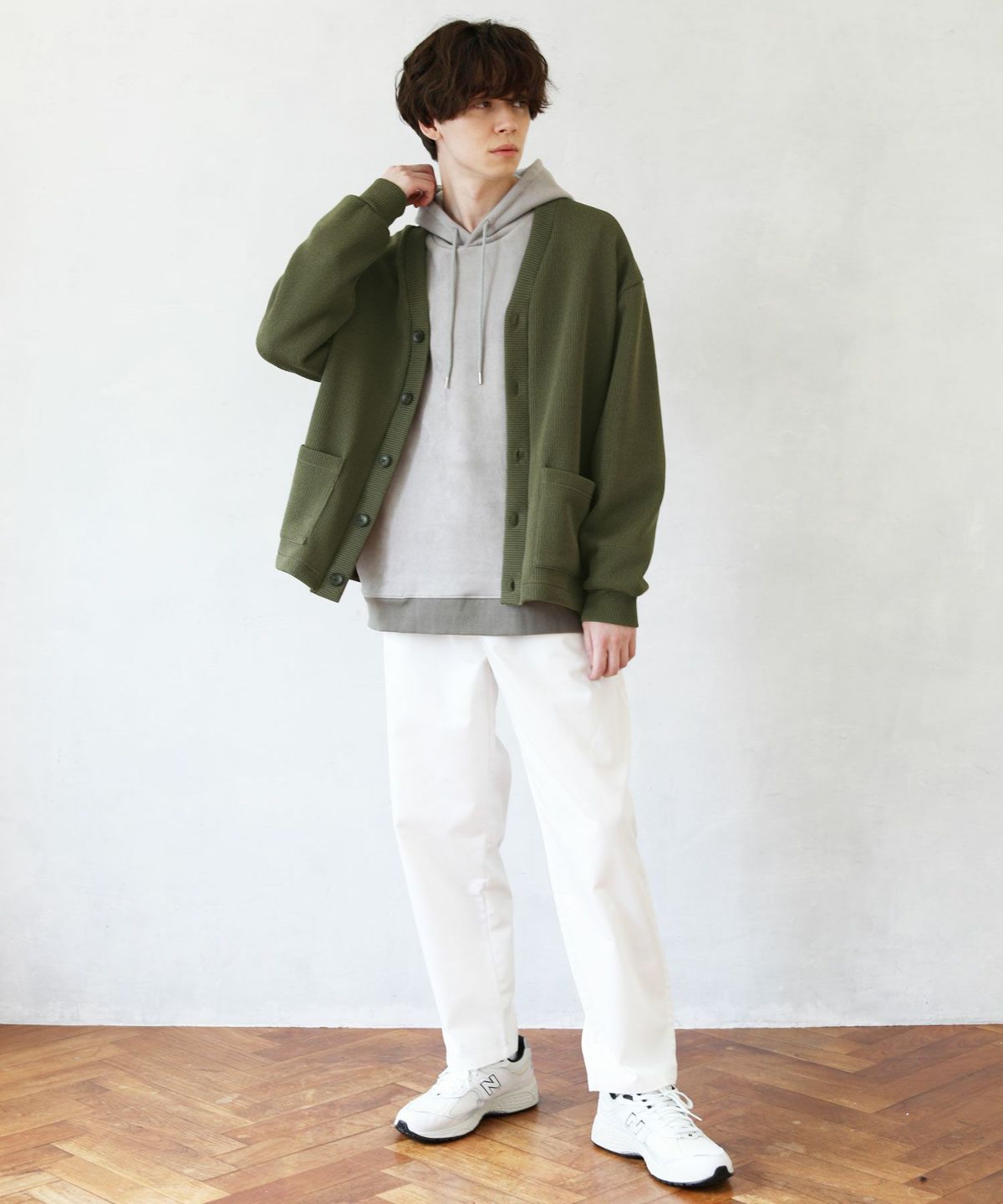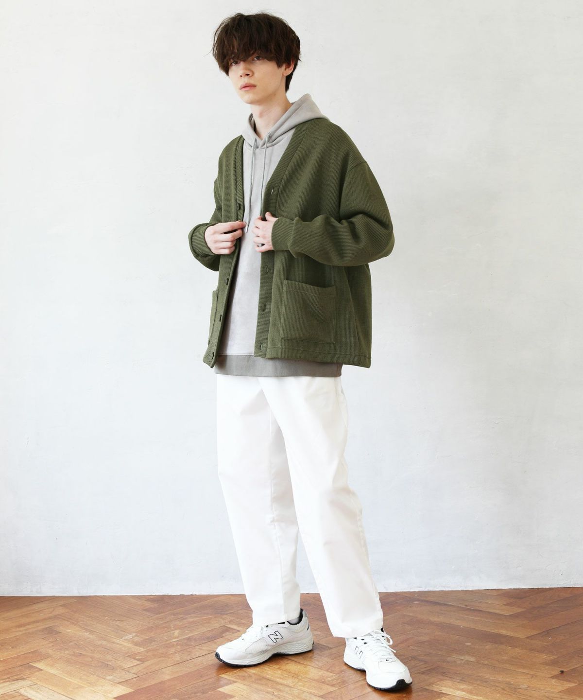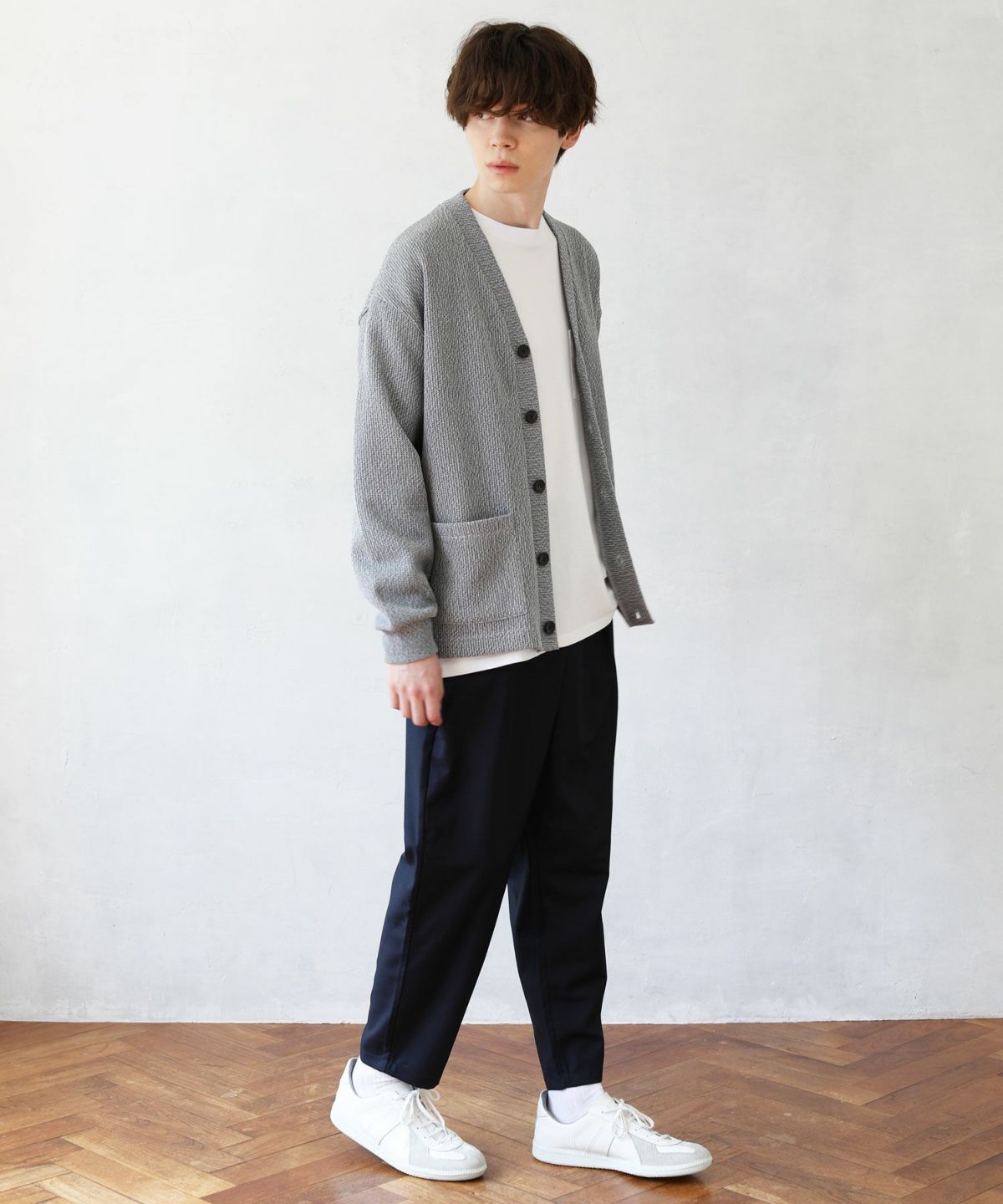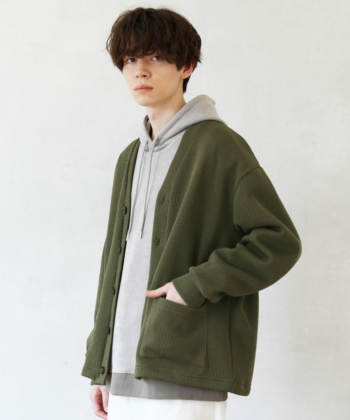 クォーターゲージの生地を使用したニットライクな国産カーディガン。ざっくりとした編み地がカジュアルな印象を醸します。シンプルな無地のカラー展開で、アウターとしても重宝する着回し力抜群のアイテムです。
