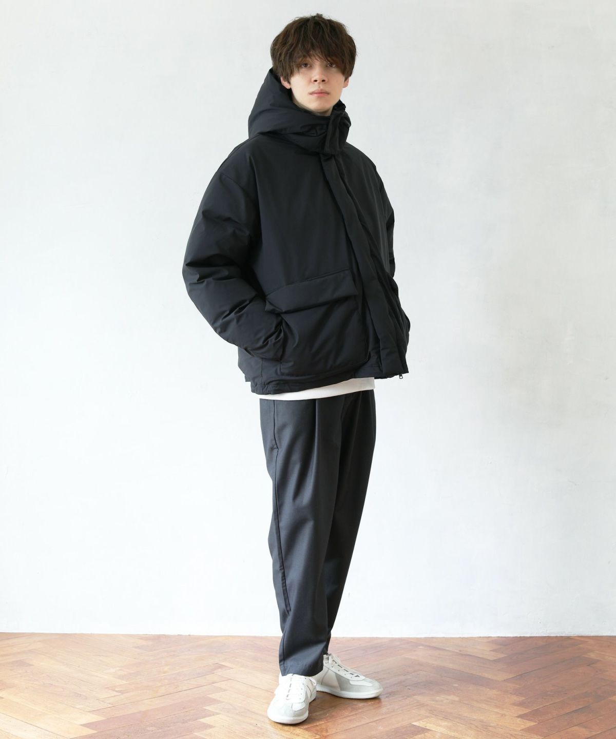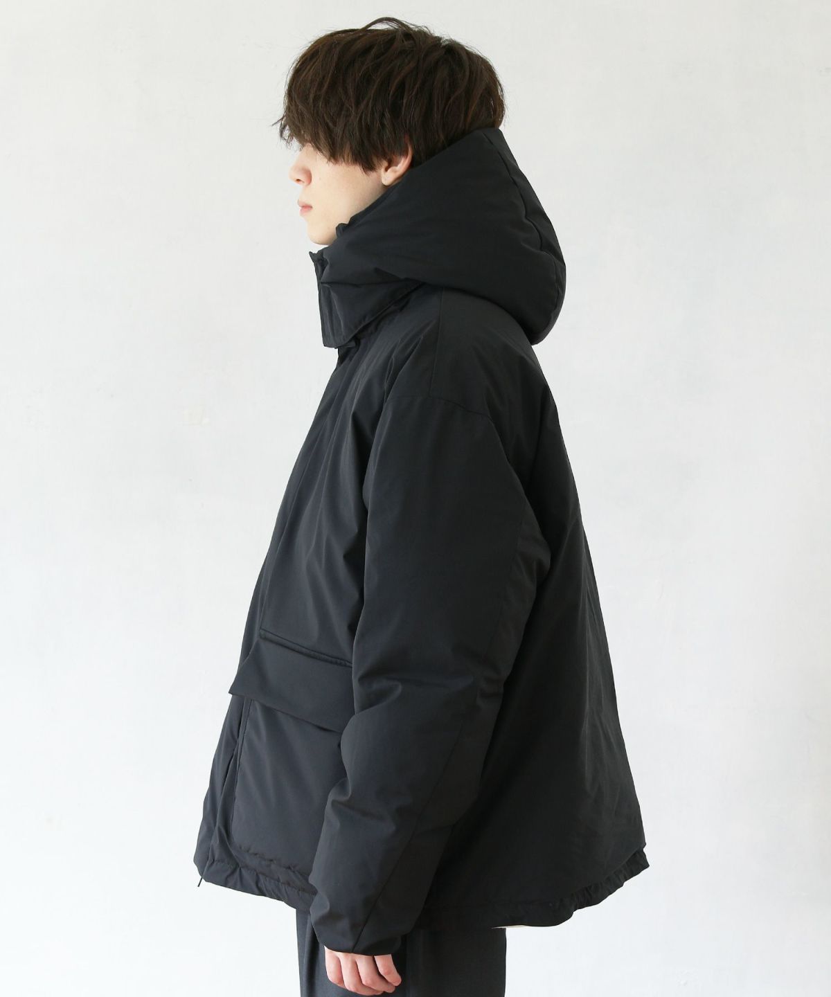 320gのダウンを詰めたボリューム感と保温性が特徴で、トレンドのオーバーサイズのスタイリングにも取り入れやすいアイテム。フードは取り外しができ、スタンド襟のアイテムとしてもコーディネートが可能です。