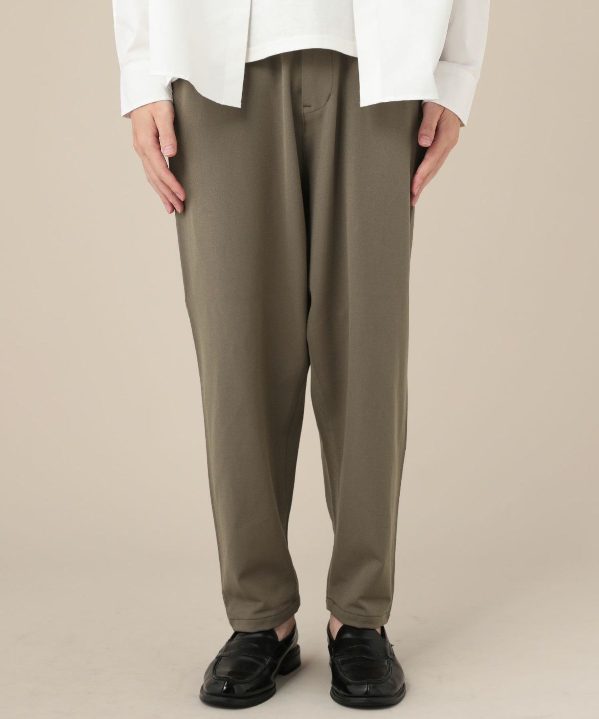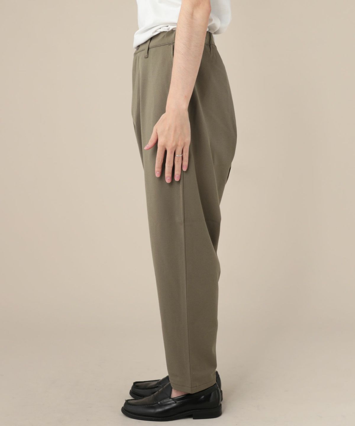 毛織物の産地として知られる尾州で織られた、国産イージーパンツ。柔らかく伸縮性のある生地で、夏は涼しく冬は暖かな機能性素材(アウトラスト)を使用しているため、1年を通して快適な穿き心地です。