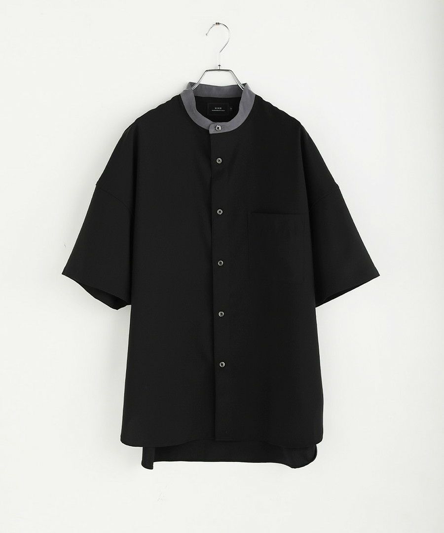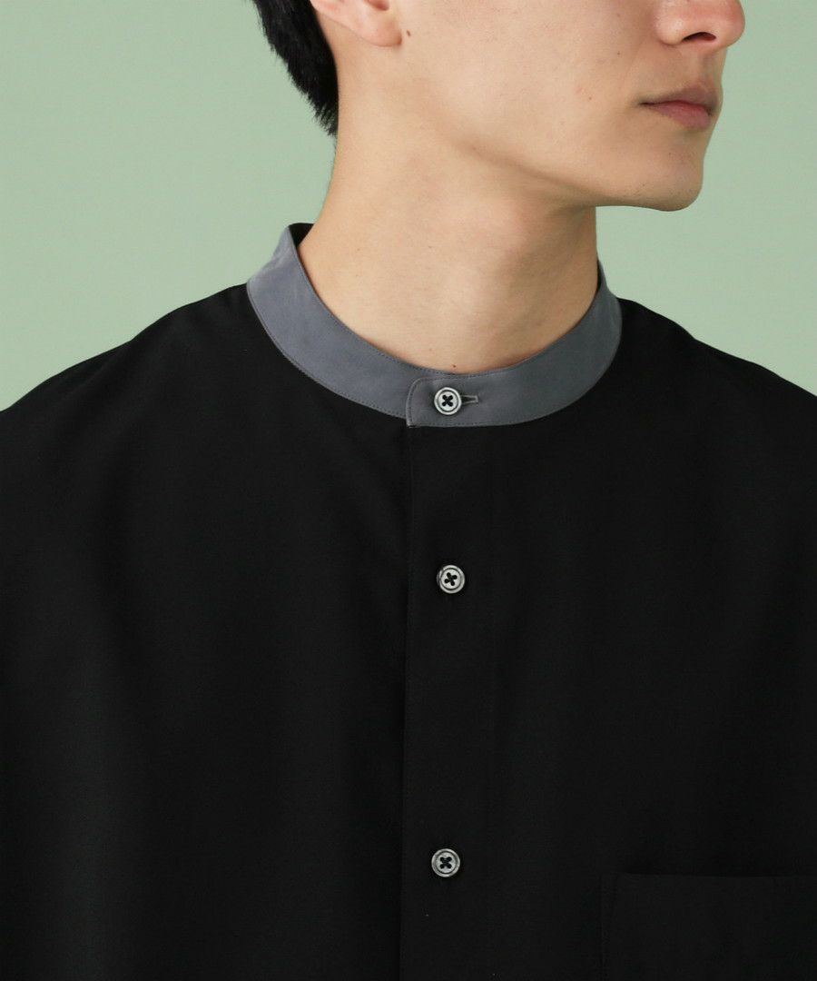 襟とボディで配色を変えたクレリック襟が特徴のオーバーサイズのバンドカラーシャツ。 素材感を生かすようにそぎ落としたミニマルなデザインですが、台襟の配色で単調になり過ぎない印象にまとめてくれます。 脇の縫い目は折伏せ縫いや、運針の細やかなステッチを採用したりと、縫製も丁寧に行った日本製です。