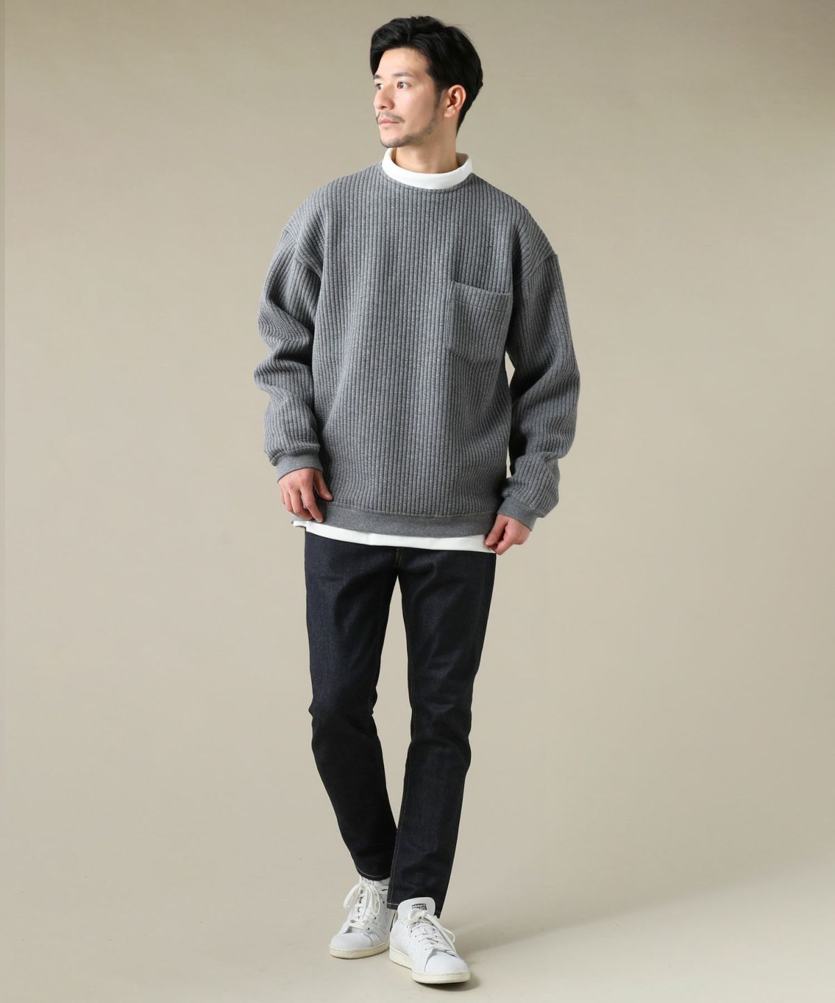 日本製尾州コットンキルト胸ポケ付きクルーネックプルオーバー