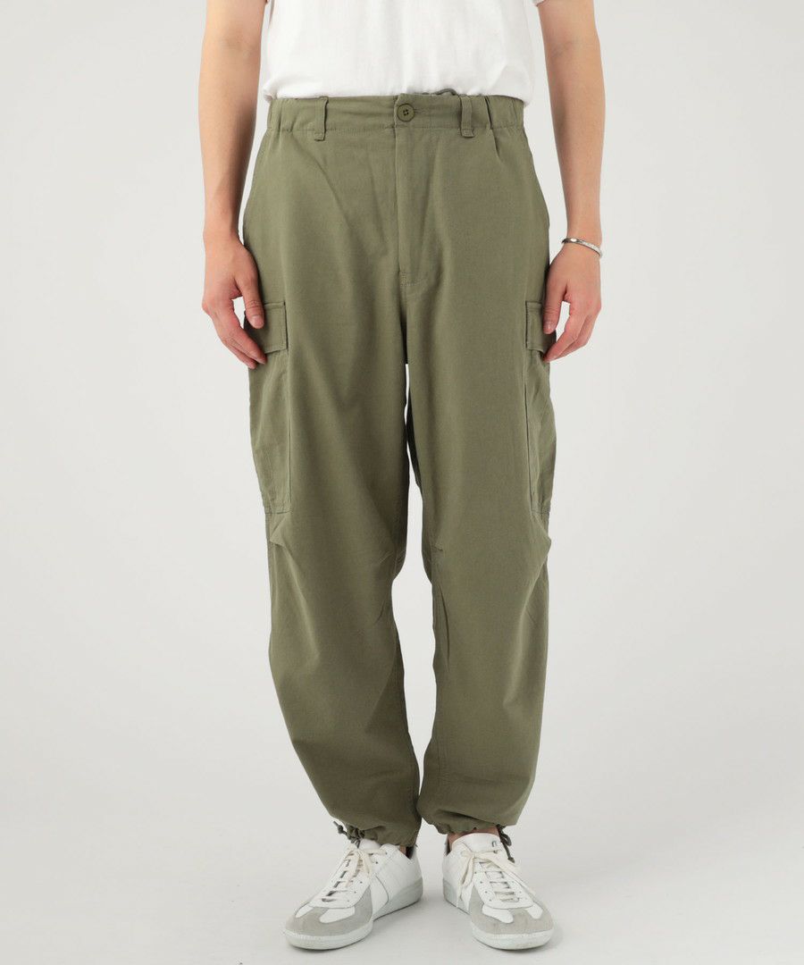 また、シルエットを変化させる裾のコードが目を引くディテールポイントになります。裾を開いた状態だとワイドパンツのような感覚で穿くことができ、裾を絞ればより本格的にミリタリーな雰囲気のあるシルエットが完成します。
