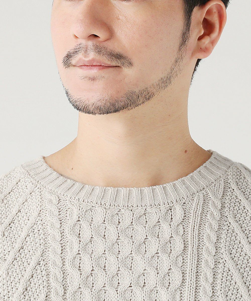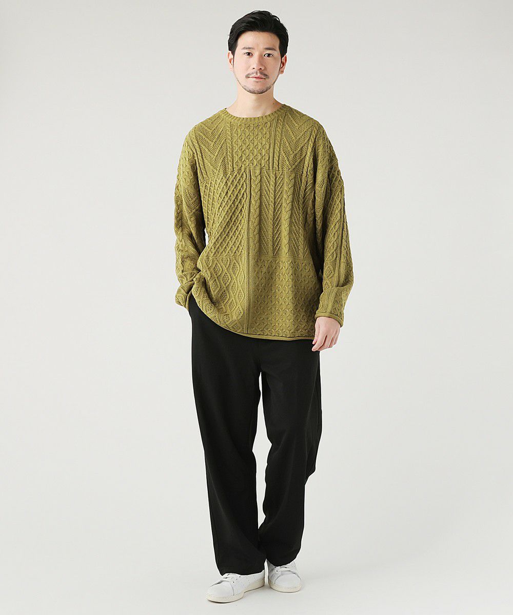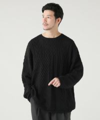 さまざまなパターンのケーブル編みをパッチワークのように組み合わせた立体感のある総編み柄で、単調になりがちなこの季節のコーディネートのアクセントになる一着。