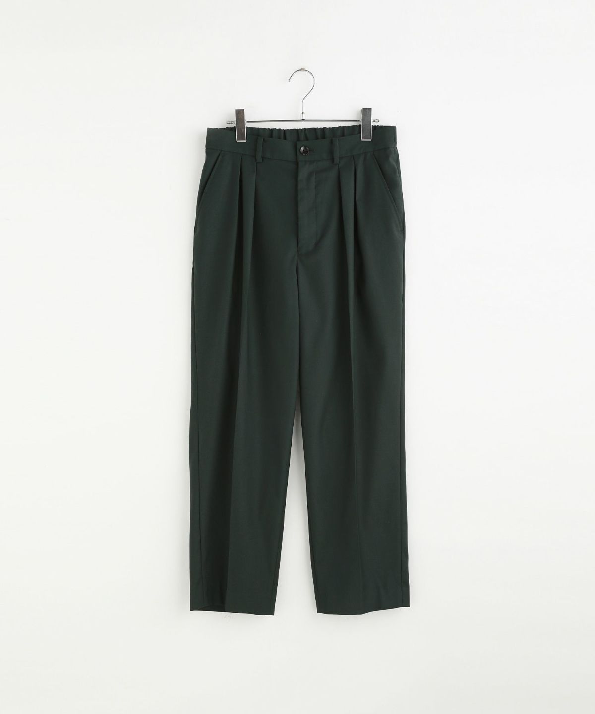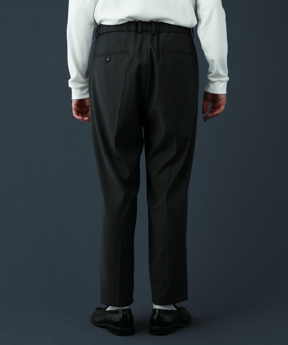 ウエスト後ろにゴムが入ったイージパンツ仕様で、2つのインタックによる腰元のボリューム感が特徴的。 ジャストレングスで裾にかけて入ったテーパードラインがアクセントになり、程よくゆったりとしたシルエットがトレンドを押さえたアイテムです。