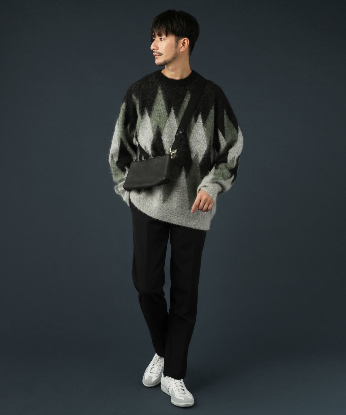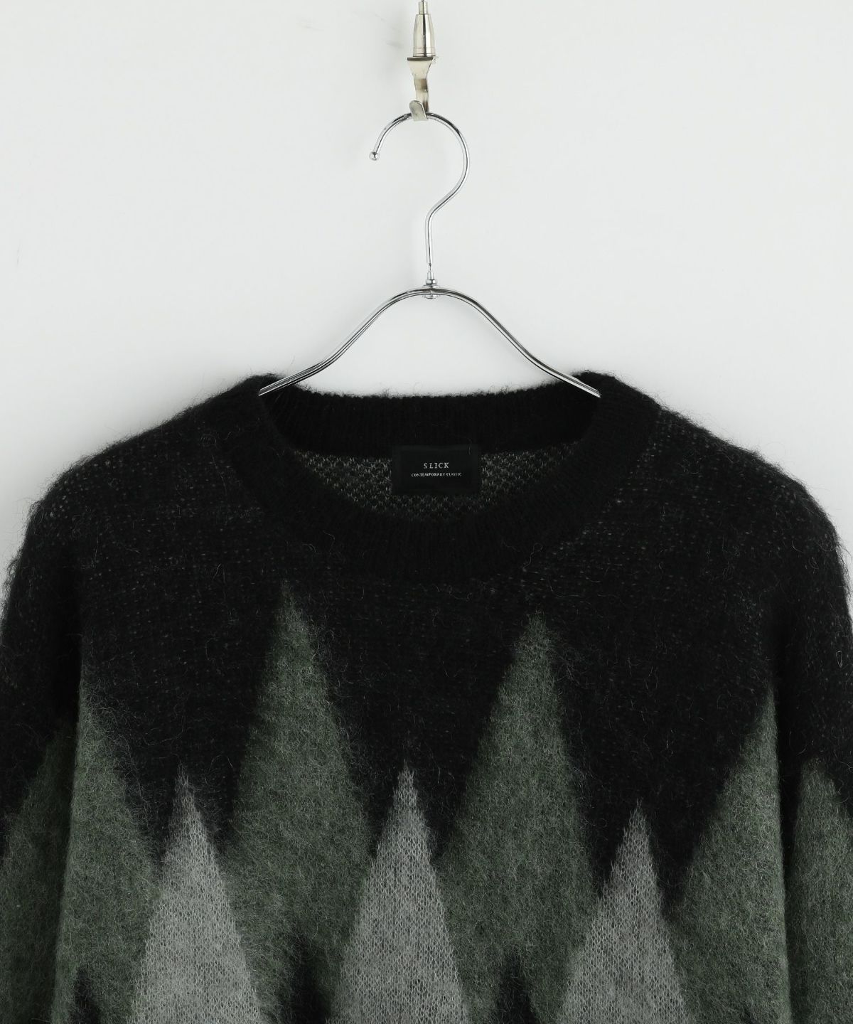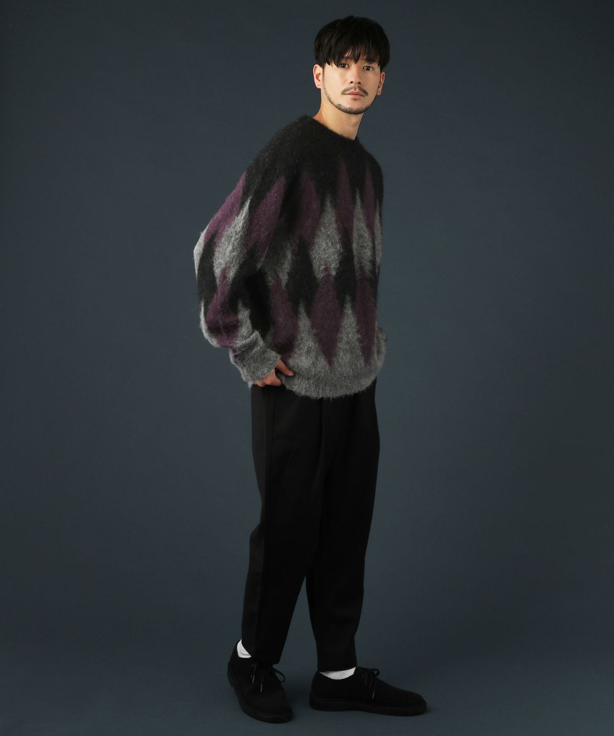 アーガイル柄をジャガード編みで表現したプルオーバーニットです。 上質で柔らかなモヘアにシャギー起毛を施したエアリーな一着。繊維の中に空気を含みやすく、軽さと暖かさを兼ね備えています。