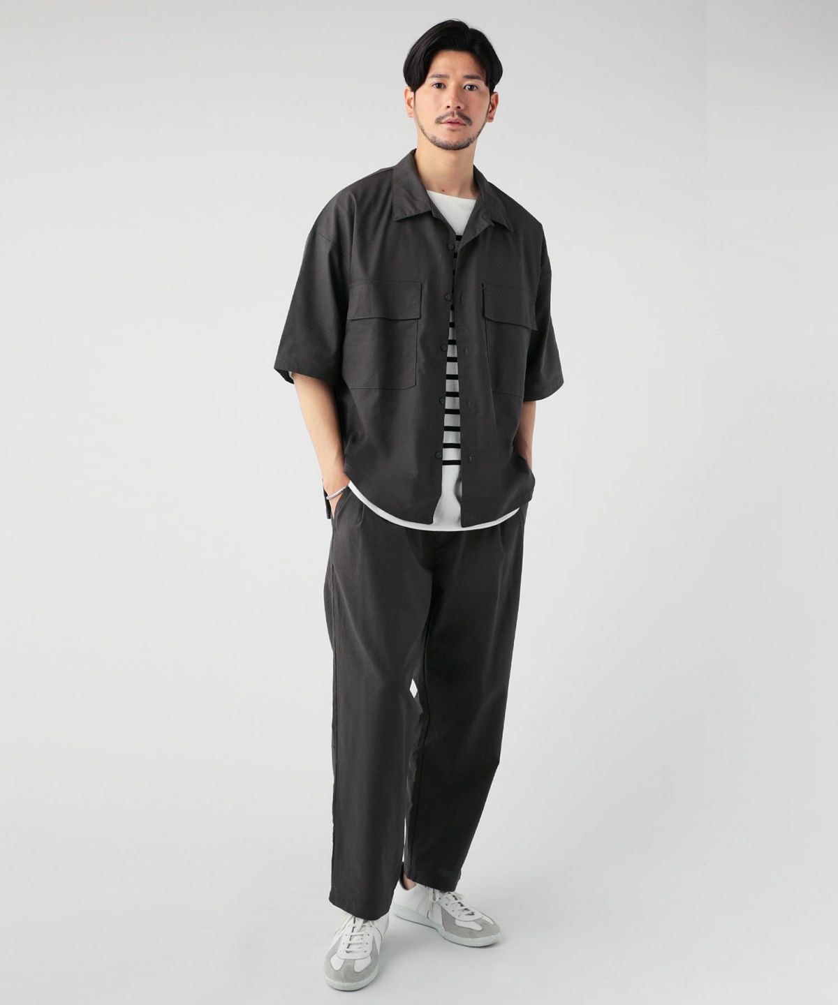 シャツだけでなく、羽織としてコーデに組み合わせるだけで大人のリラックススタイルが完成。