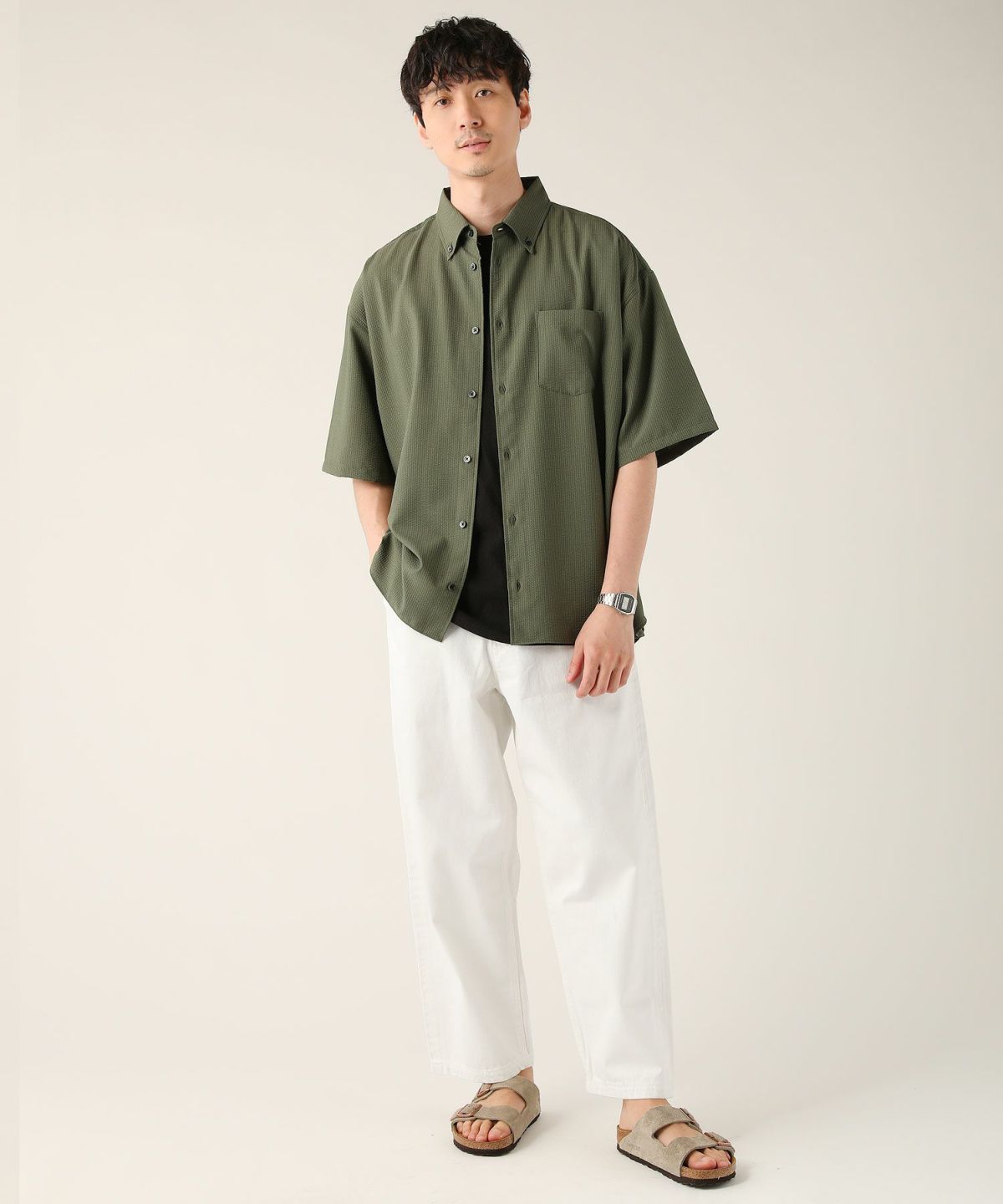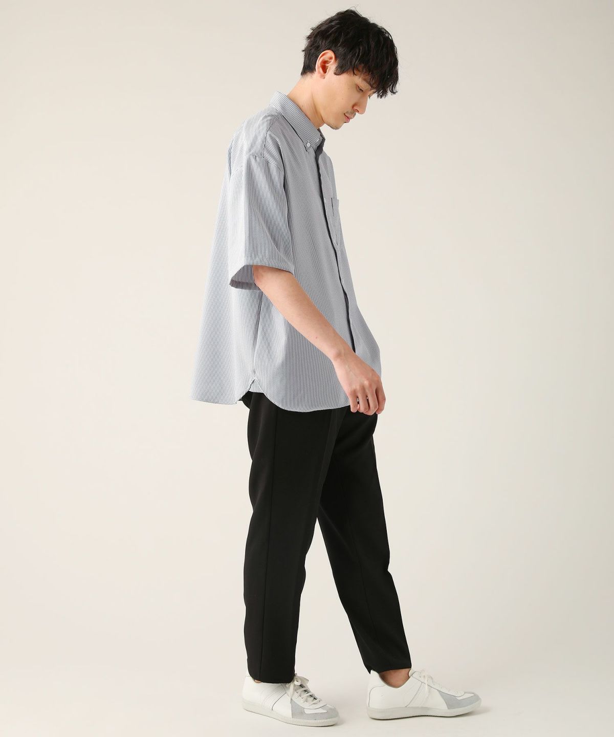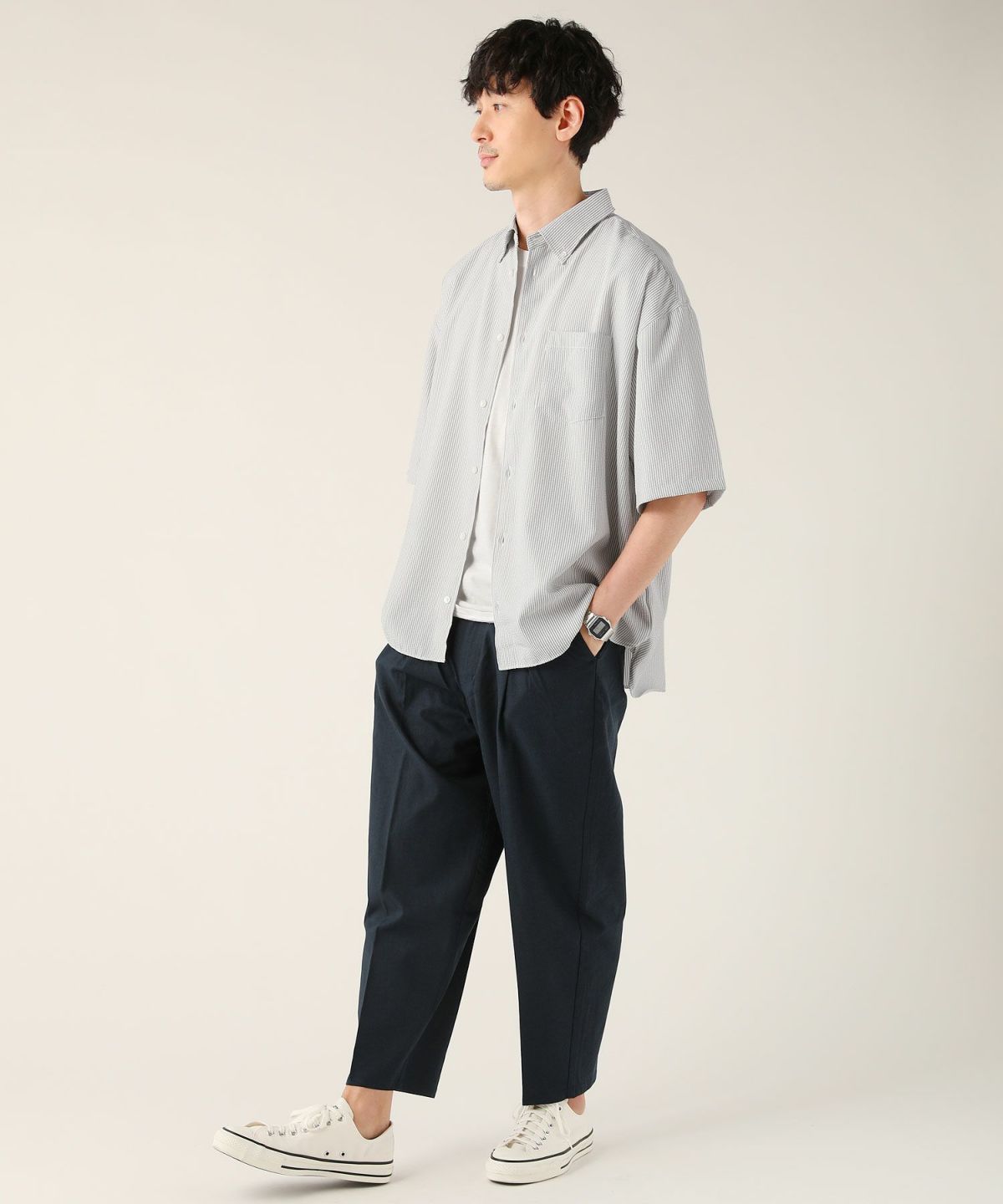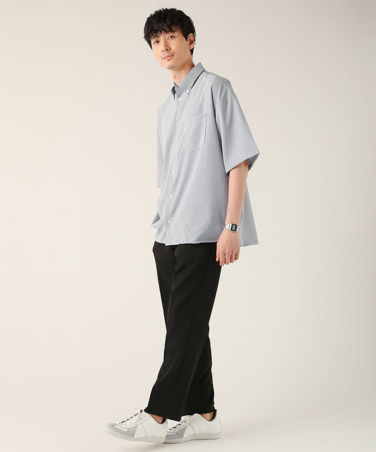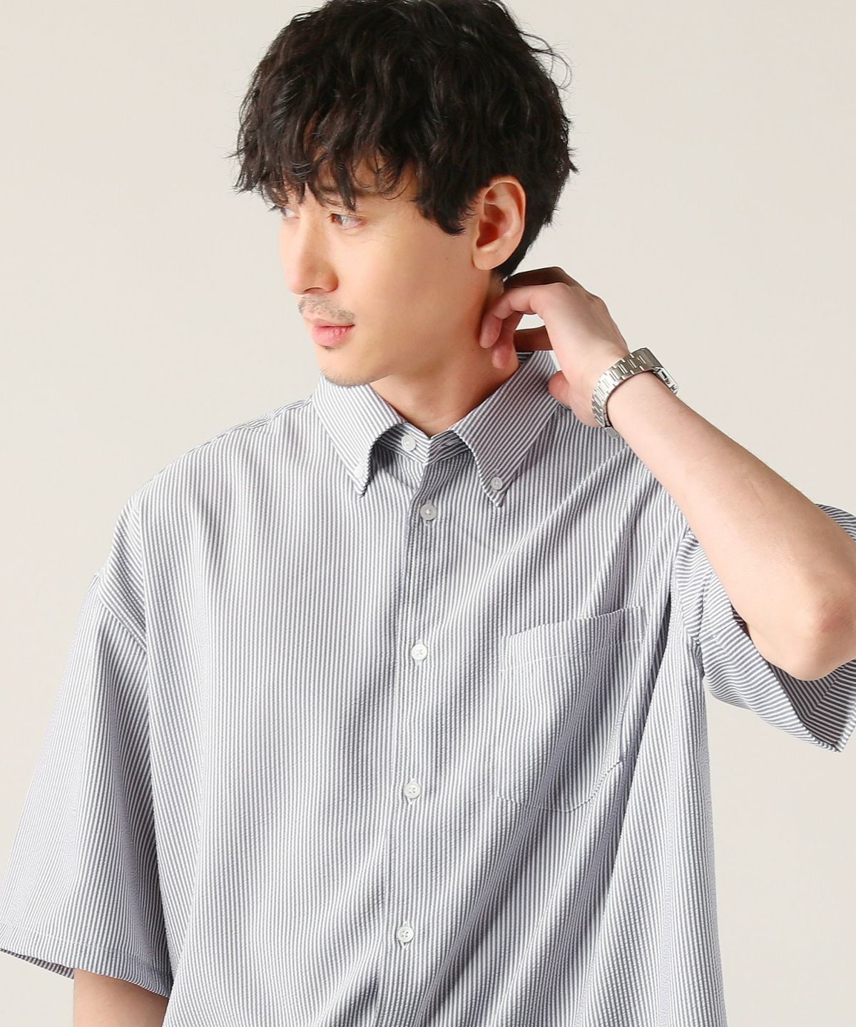 日本製ポリエステルサッカーストライプボタンダウンボクシーAラインハーフスリーブシャツ