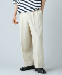 ドライタッチなカルゼ生地を使用したスラックス。程よくテーパードしたワイドシルエットで、フロントにタックとセンタープレスを入れることでクラシカルな印象に。カジュアルからキレイめまで幅広いスタイルに合わせてやすく、ワイドパンツながら着回しやすさにこだわった快適な一着です。