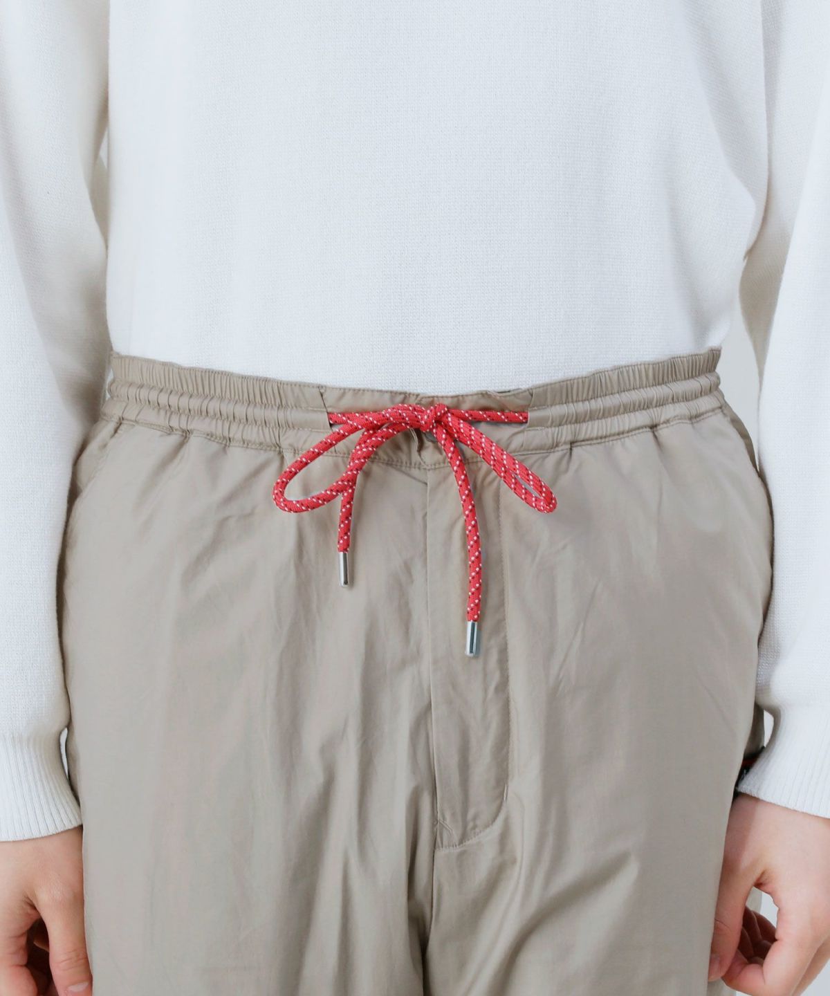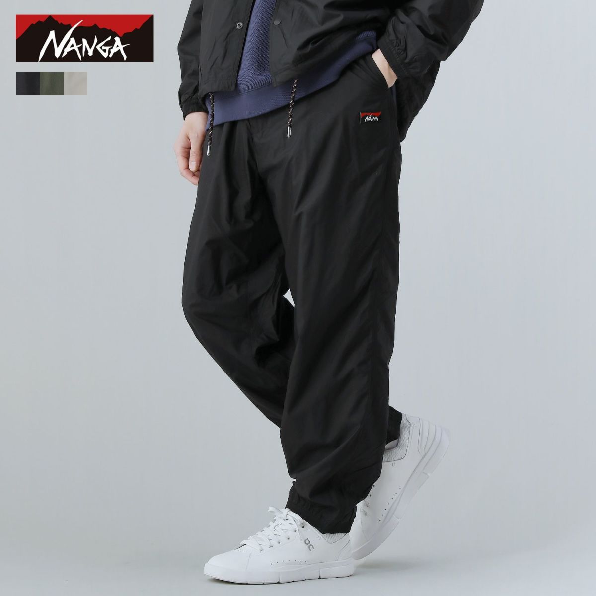 ゆったりとしたサイズ感ながら、脚に程よくフィットするディテール面もポイントです。ウエストは、ドローストリングのイージーパンツ仕様でジャストサイズに調節可能。内股はマチをつけたガゼットにする事で、アクティブシーンでも活躍します。両サイドのポケットの他に右ヒップにもポケットを配置。ヒップポケットのファスナー部分にはNANGAのブランドロゴとリンクしたカラーのパラコードを付けました。ジップ仕様なのでイヤホンや鍵などの小物も安心して収納できる使い勝手の良さもポイントです。