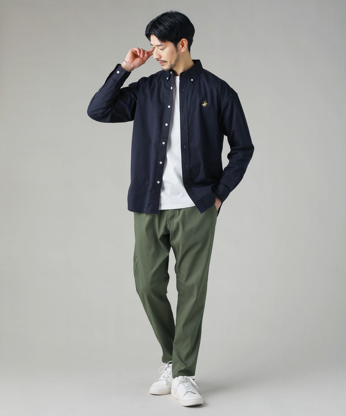 生地は糸密度を上げて織るツイル生地で、綿100%のため丈夫で肌なじみがよく着込む程に風合いが出ます。さらに襟の先にボタンが付いたボタンダウンシャツなので型崩れしにくく、デイリーユースにおすすめです。左胸のさりげないロゴ刺繍のワンポイントデザインがアクセントに。1枚で着られるのはもちろんのこと、ちょっとした羽織ものとしてもお使いいただけます。