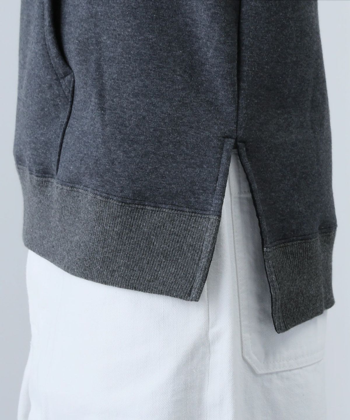 裏起毛生地ではありますが通常のスウェット生地よりも柔らかく、伸縮性にも優れており、さらにシルエットをすっきりとさせているため上着も羽織りやすく、動きやすくなっております。