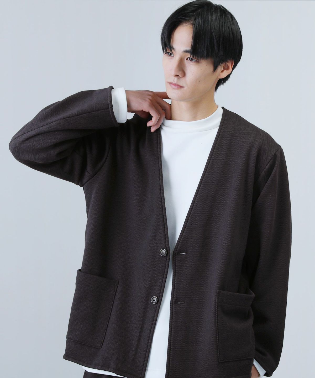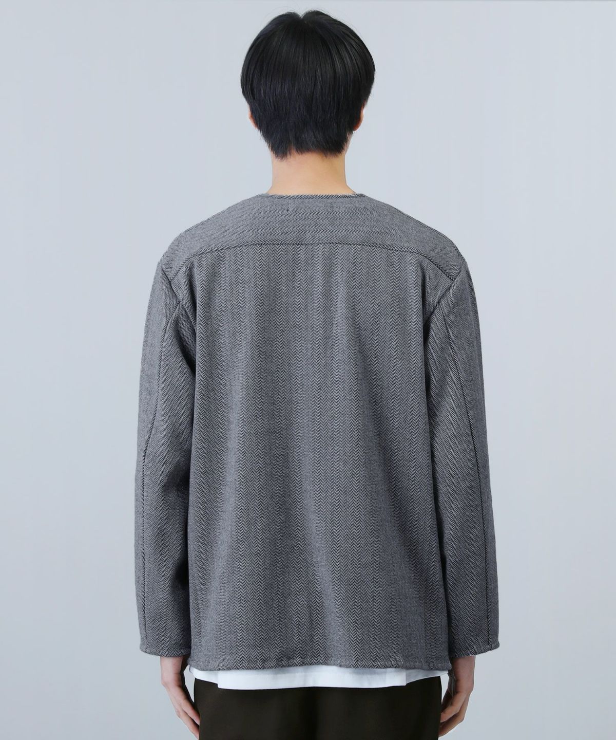表面はヘリンボーン柄のジャガード風組織になっていて布帛生地のような印象で、裏面は優しい肌触り。きちんと見えさせながらもスウェットのようなラクな着心地が魅力的な一着です。