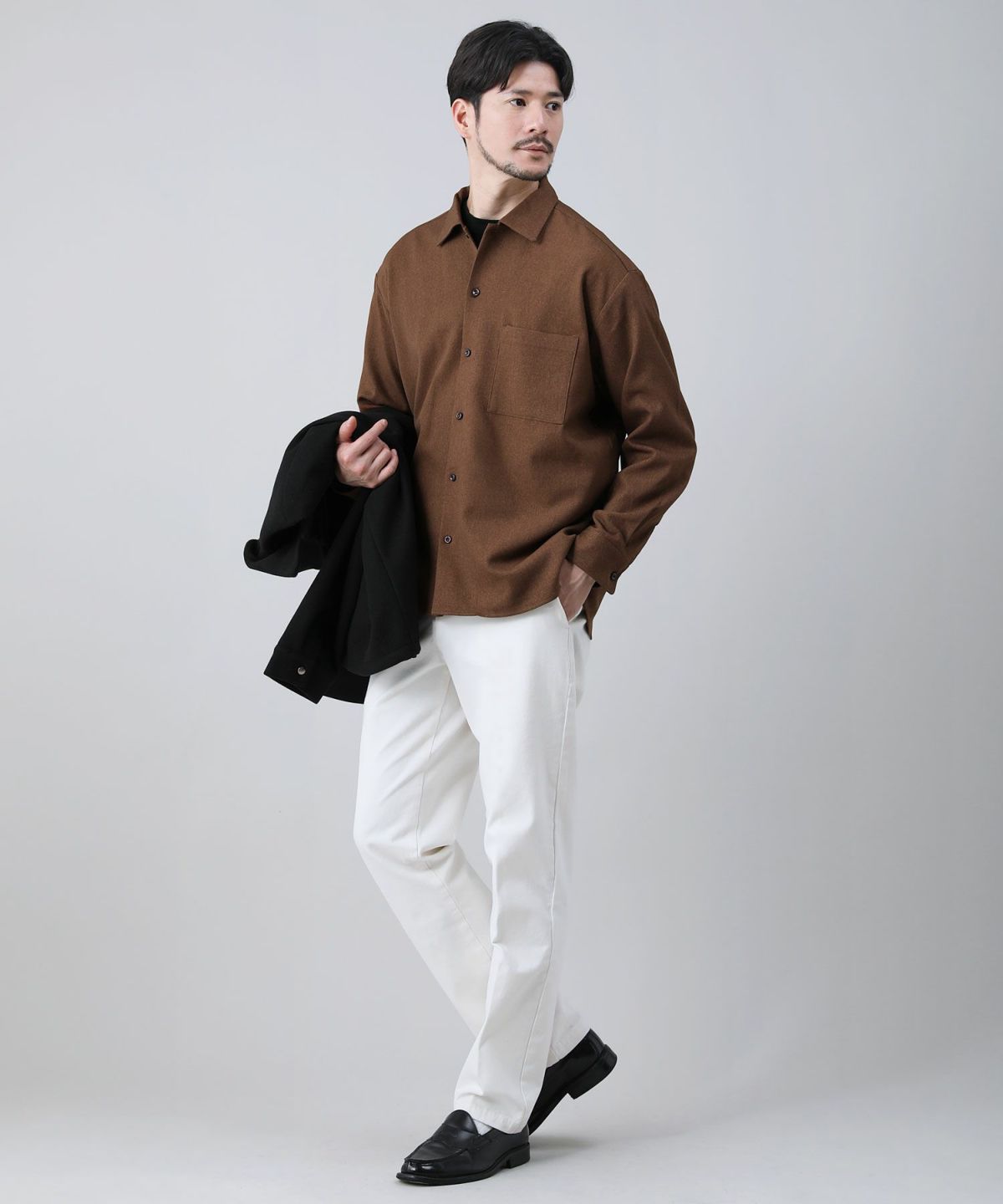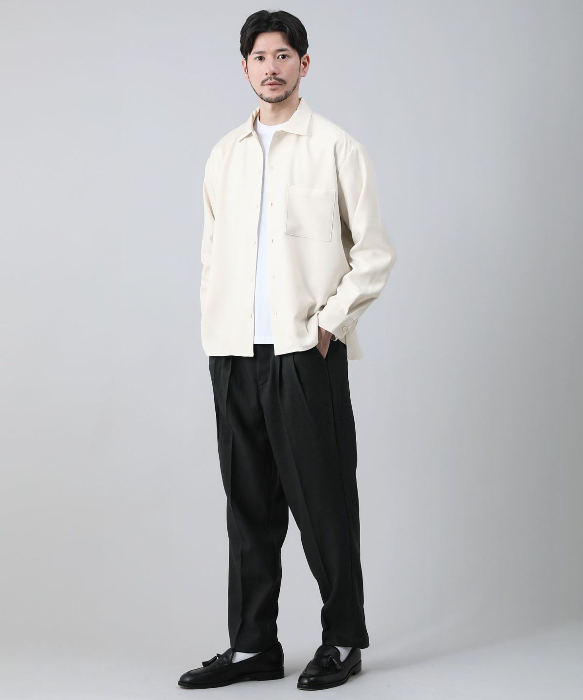 落ち感のある素材とシャツの相性は抜群。オーバーサイズシルエットをベースに、前後差のあるデザインがさり気ない抜け感を出します。
