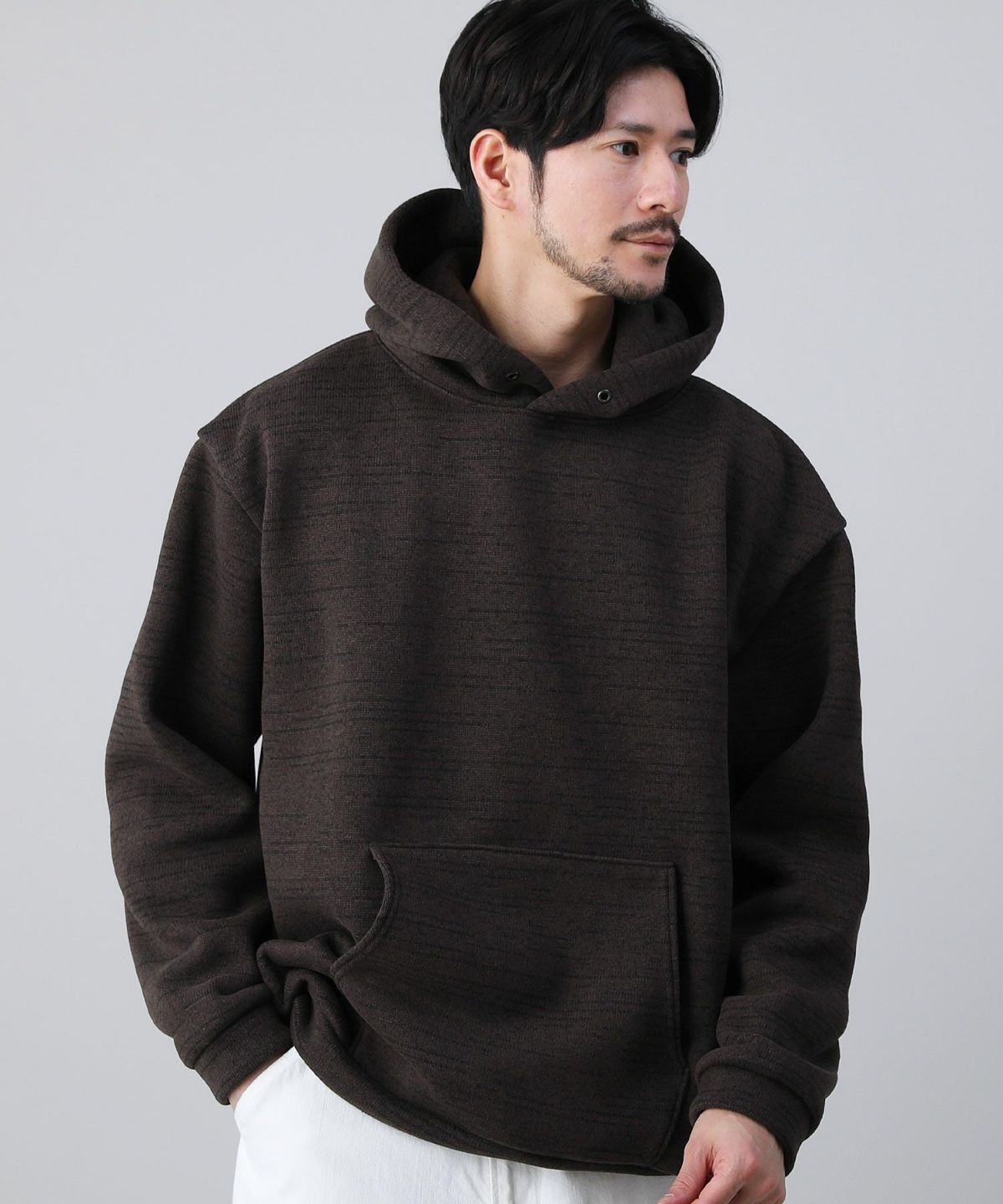 表面の上品なメランジ感が際立つセーターのような見た目で、落ち着いたシンプルな色合いが魅力的。紐なしパーカーなのでスッキリと見栄えが良く、サイズはリラックス感のあるドロップショルダーでストレスフリーな着心地です。また、腹部に設けられたカンガルーポケットはデザイン性だけでなく手を温めるのにも便利です。