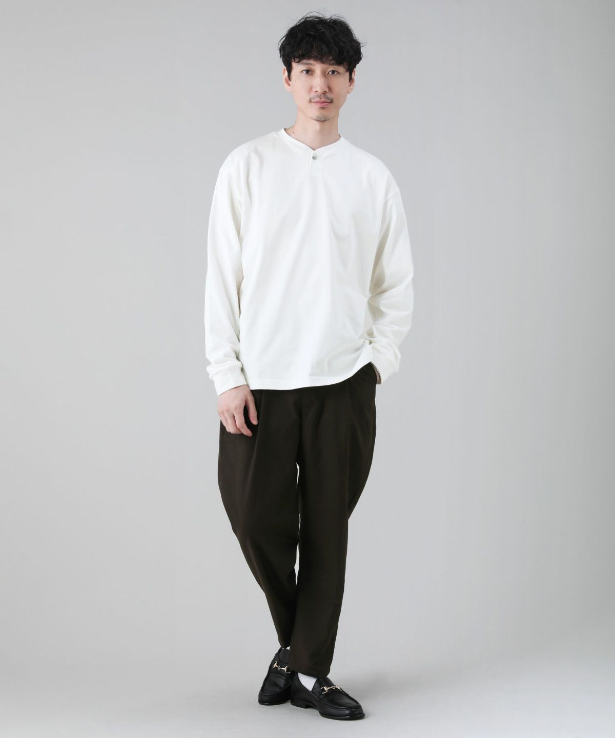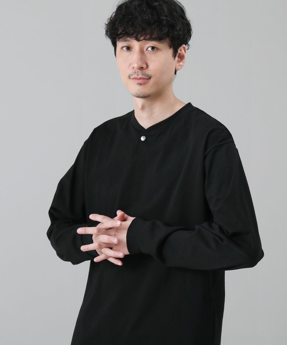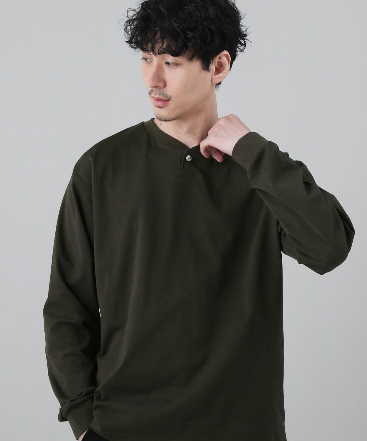 クリアで高品質な生地感が魅力のヘンリーネックロングTシャツ。