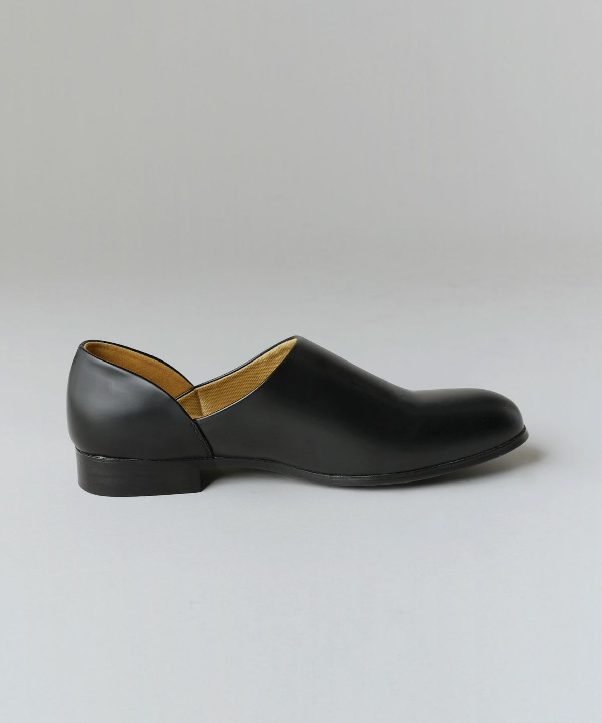 医師が院内で履く室内履きを目的として作られたスポックシューズは、サンダルのように楽に履けることが特長。履き口のV字カッティングは、脱ぎ履きがしやすいよう考え抜かれた作りになっています。足元をスッキリ見せてくれるカッティングは、前から見ても横から見てもスタイリッシュな仕上がりです。