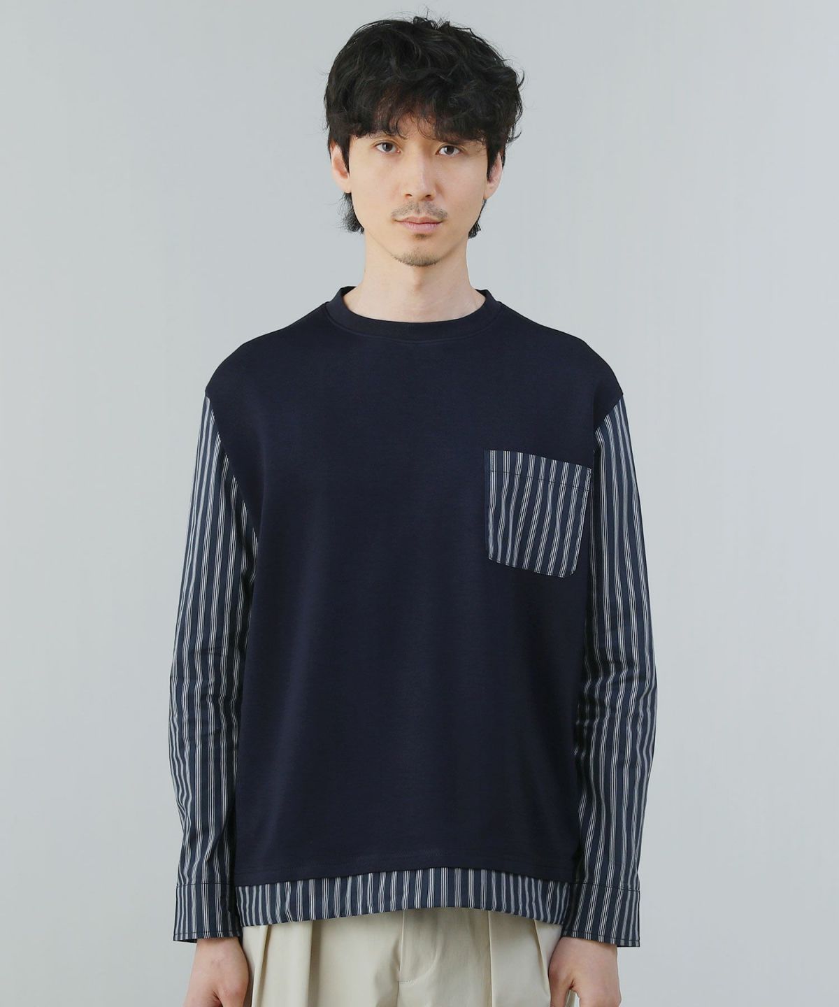 ポンチ×ストライプ布帛切り替え長袖Tシャツ