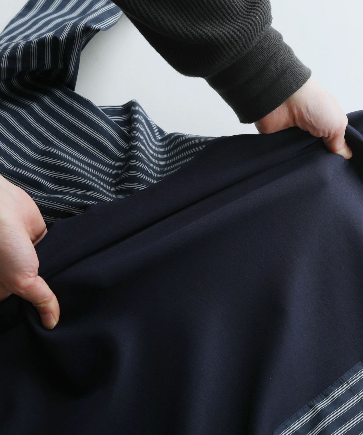 伸縮性のあるポンチ生地は身頃に、サラリとした布帛のシャツ生地は袖と裾、胸ポケットに。風合いの違う組み合わせながらも同系色の色使いで、馴染みやすくこなれた印象に仕上げました。