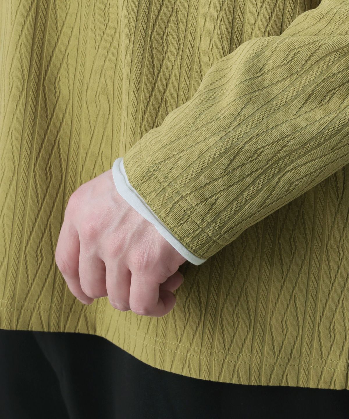 襟元や袖口から白い生地が覗くレイヤード風のデザインで、1枚で着てもバランスの良い着こなしに見せてくれます。生地にはジャガード編みで作られたケーブル模様が入っています。薄手ながらも柔らかく、品の良さを感じさせるニット地です。シャープな印象を生むVネックの襟元が、コーディネートを引き締めるアクセントになっています。