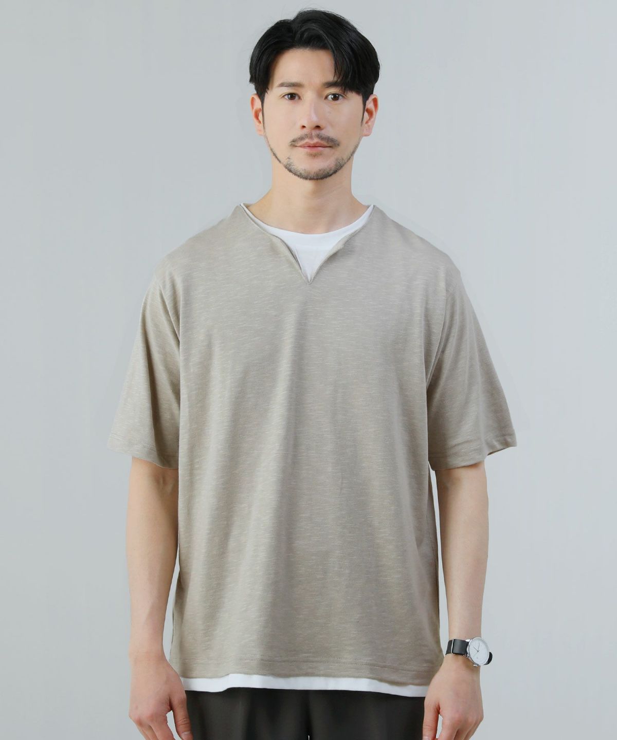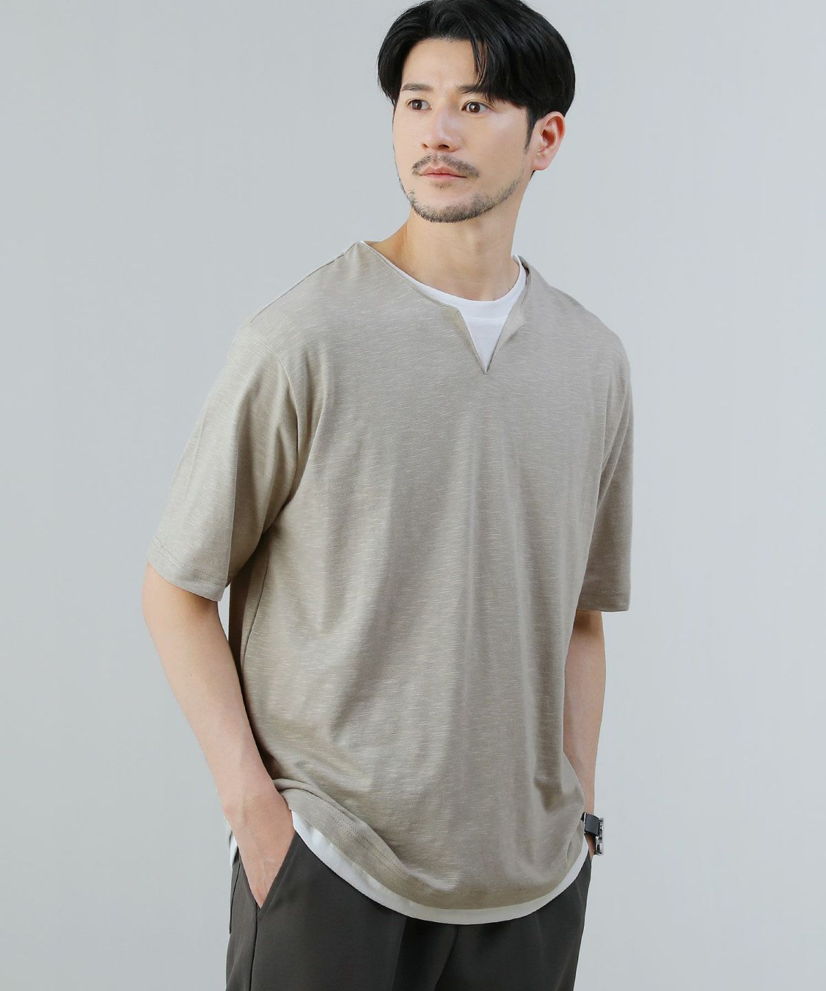 接触冷感/スラブ天竺ヘンリーネックフェイクレイヤード半袖カットソー