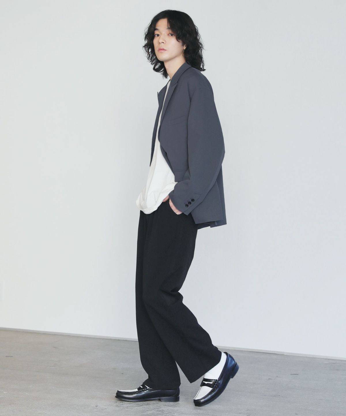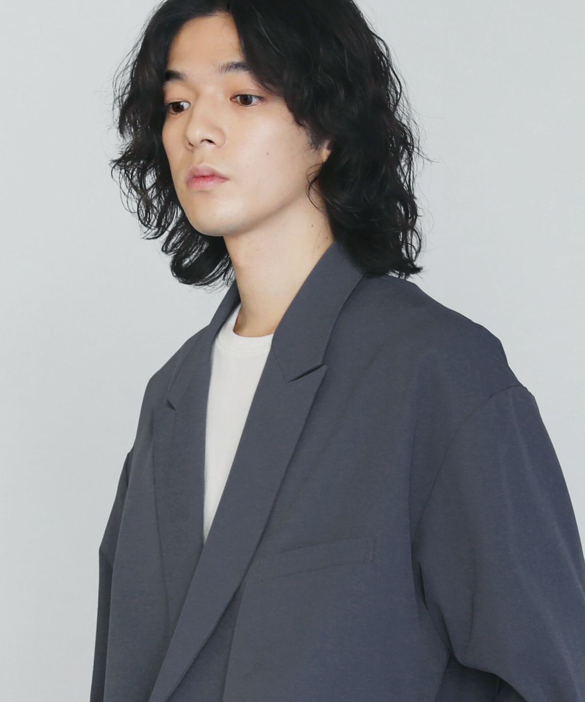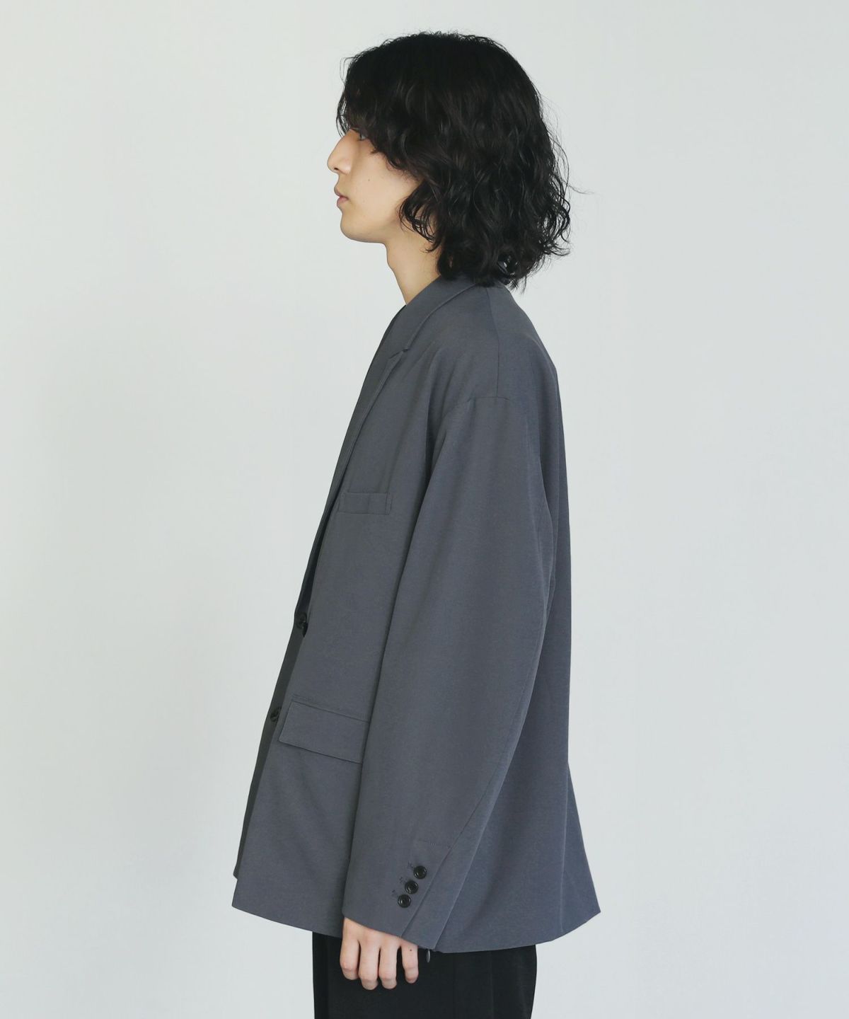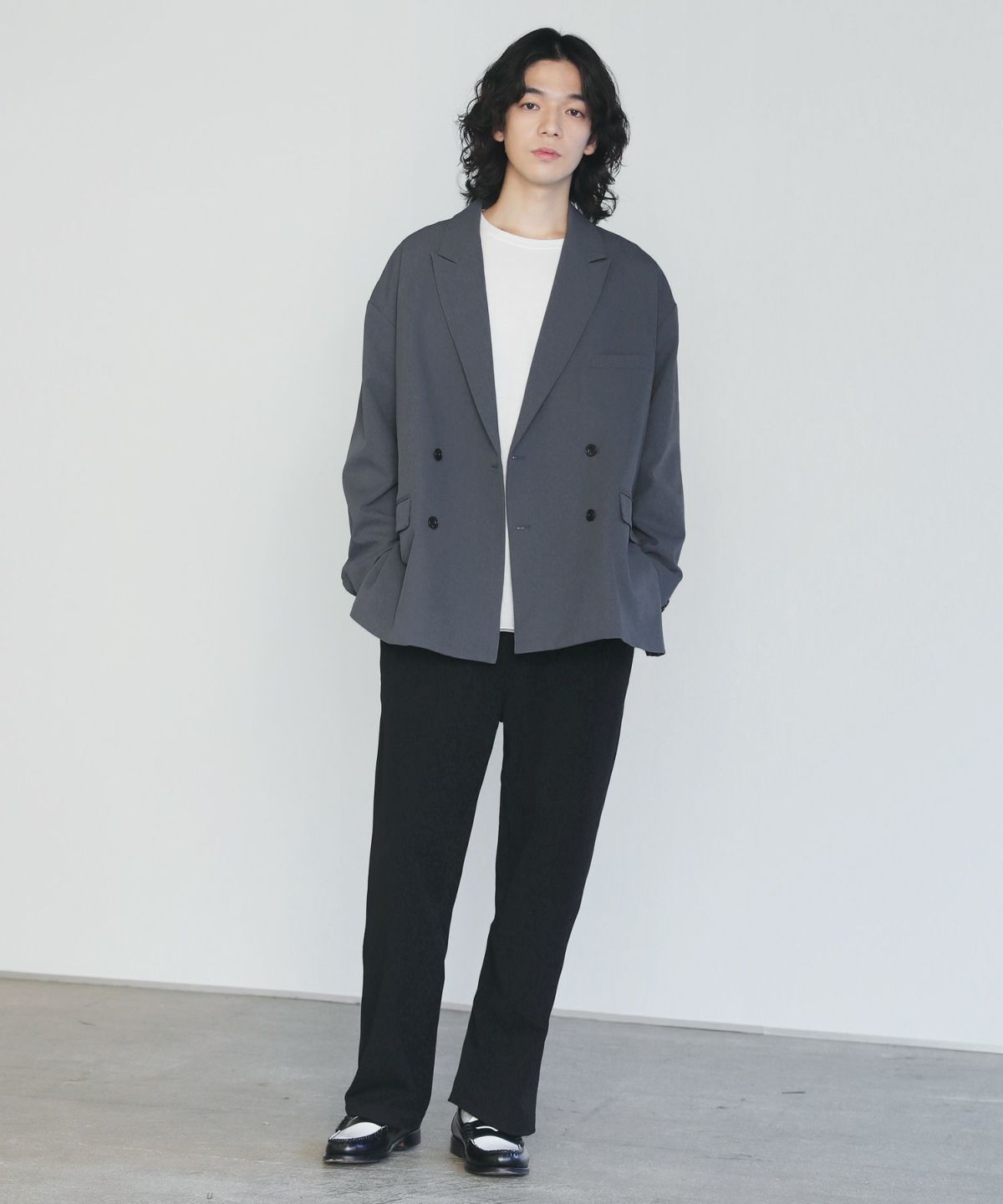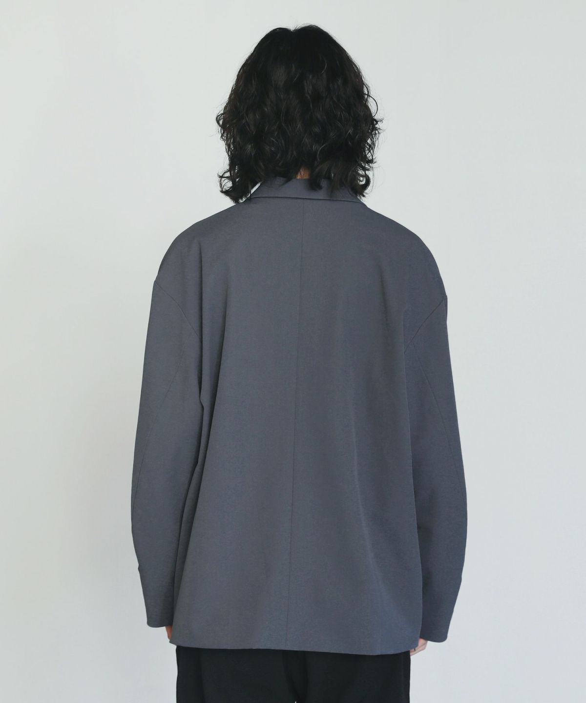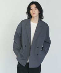 ストレッチ性を持つポリエステルツイル素材を使用した、さらっとしたタッチのダブルテーラードジャケット。素材の持つキレイめな表情と、オーバーサイズのカジュアルなルックスが程よいバランスのアイテムです。同素材のタックワイドスラックスとのセットアップスタイルもおすすめです。