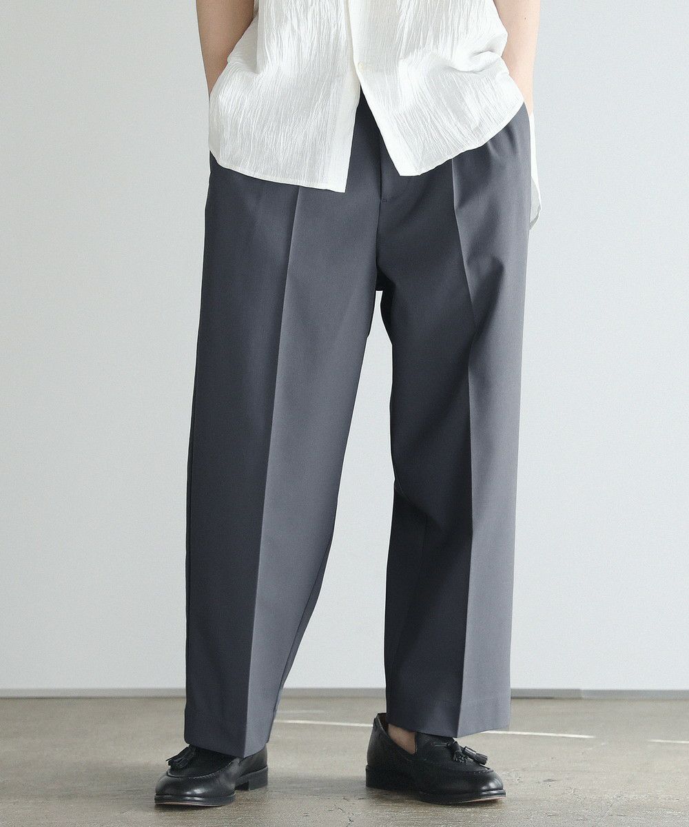 キレイめなルックスながらワイドなシルエットで程よくカジュアルダウンさせたデザイン。腰回りとわたりにゆとりを持たせているのでゆったりとしていてラクな穿き心地で、程よいストレッチ性があるので動作にストレスを感じさせません。抜群の穿き心地と手軽にケアできる素材でデイリーユースに最適なアイテムです。同素材のダブルテーラードジャケットカーディガンを合わせたセットアップコーデもおすすめです。