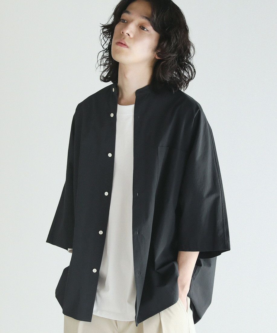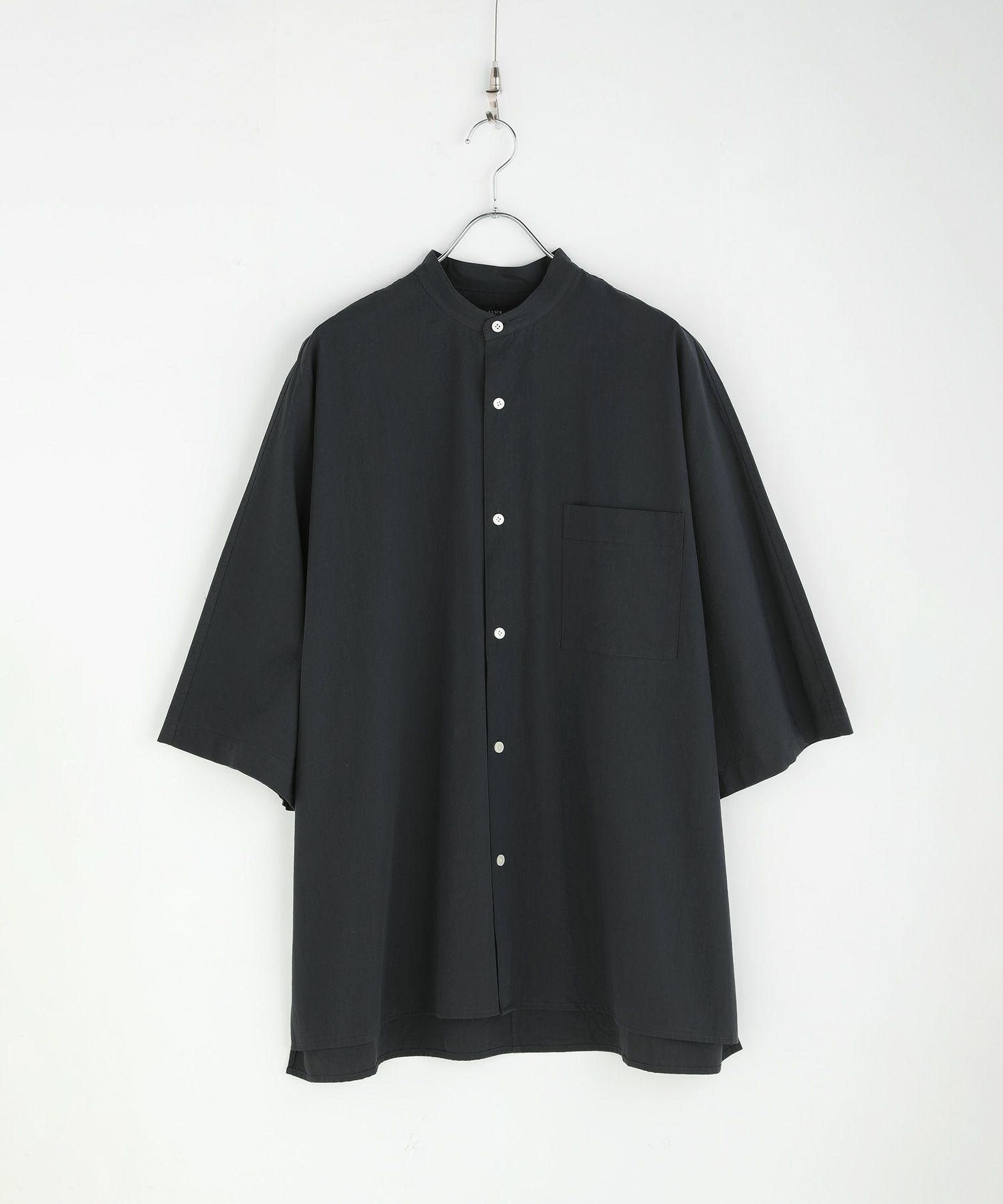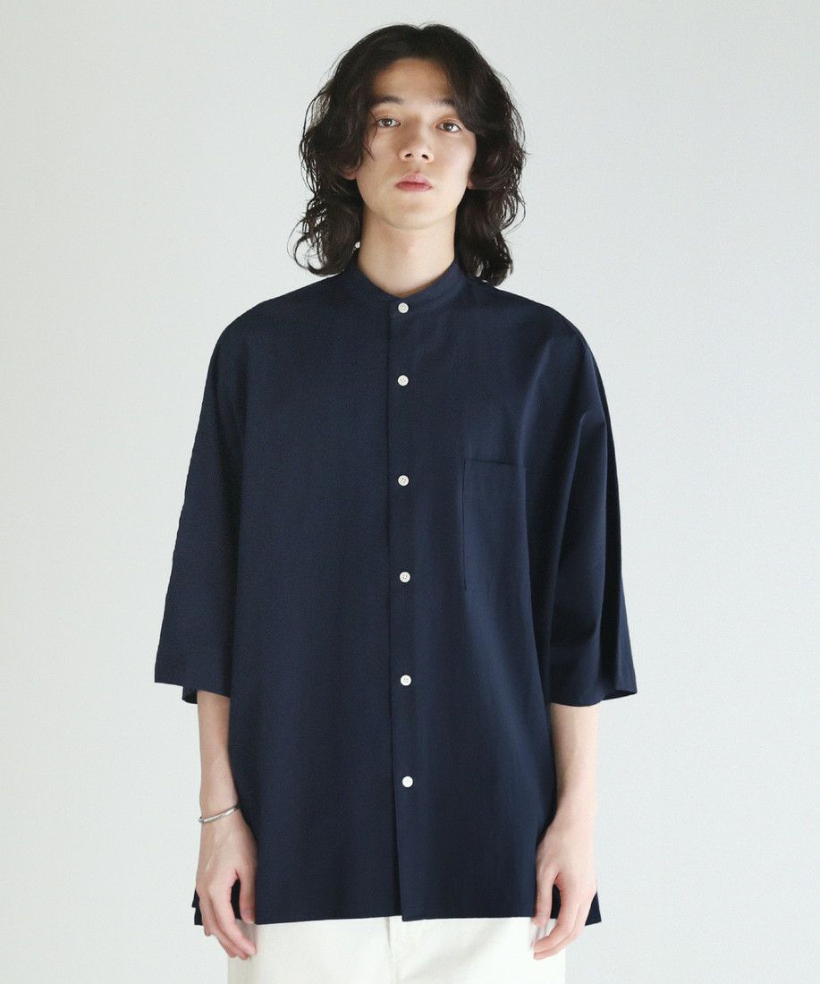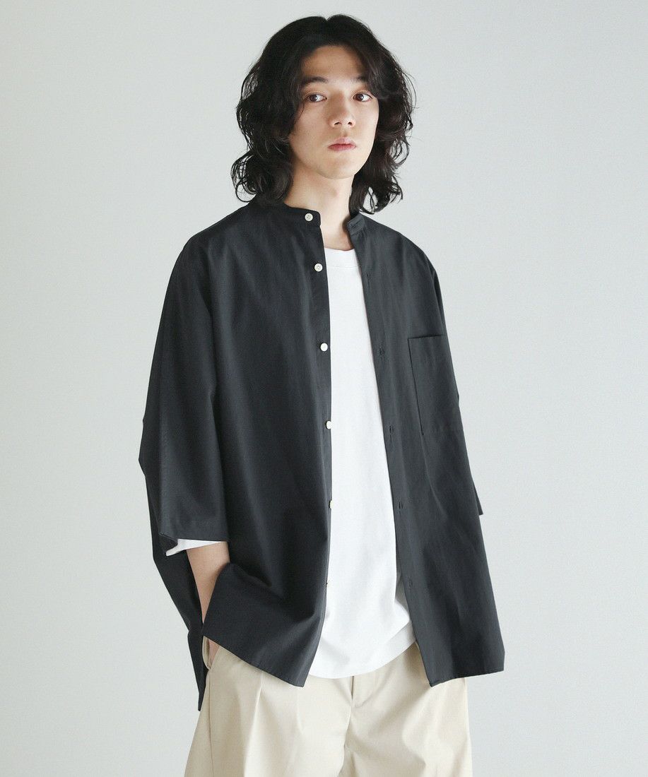ヴィンテージ感のある独特な表情のポプリン生地を使用したドルマンスリーブシャツ。ソフトなふくらみ感と洗い晒しのようなヴィンテージライクなシワ感が特徴的です。特殊な染色技法で仕上げているため他にない柔らかな発色が魅力的で、上品な印象を与えます。上襟の無いすっきりとしたネックラインが特徴的なバンドカラーを採用し、清潔感のある一着に仕上げました。