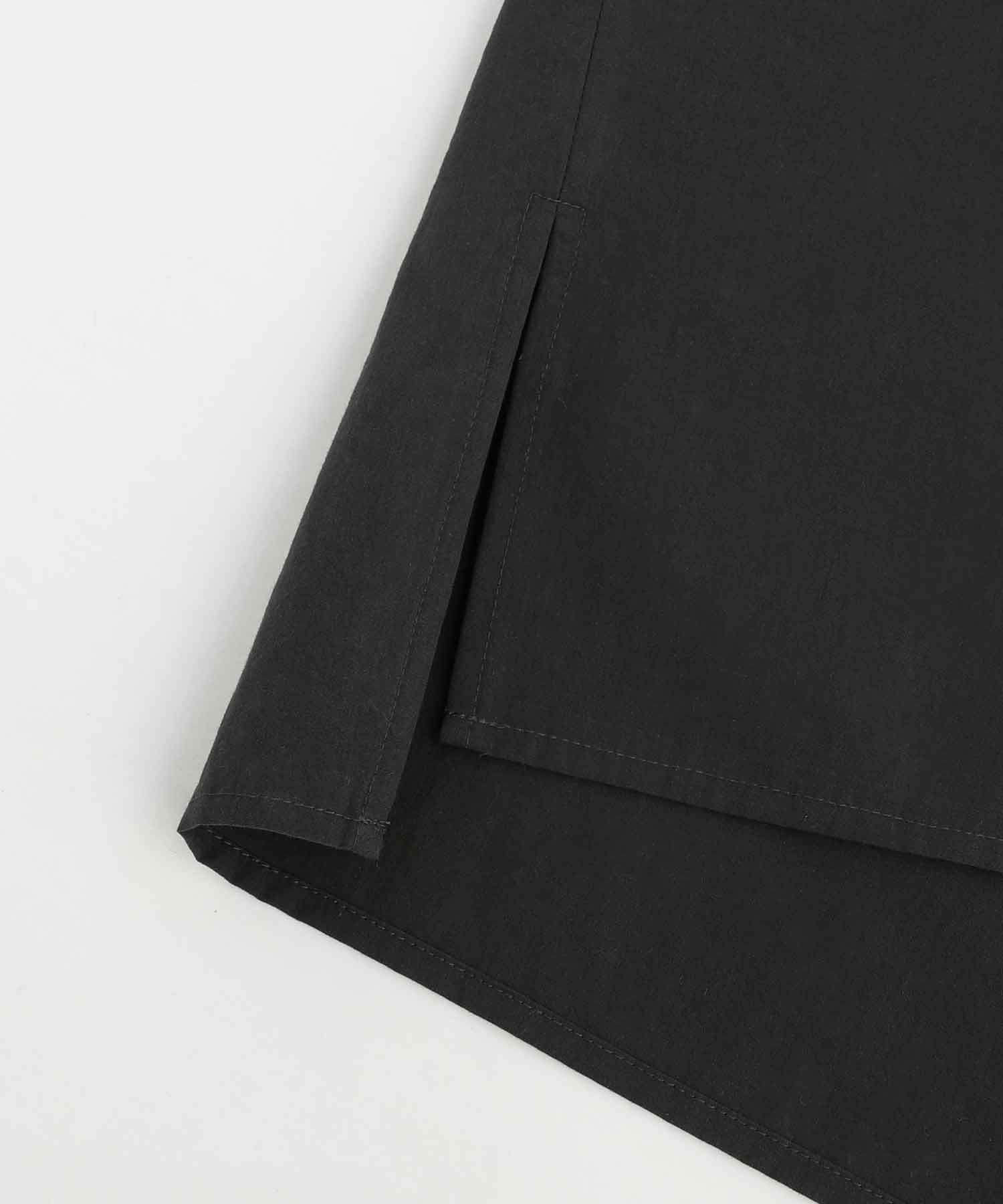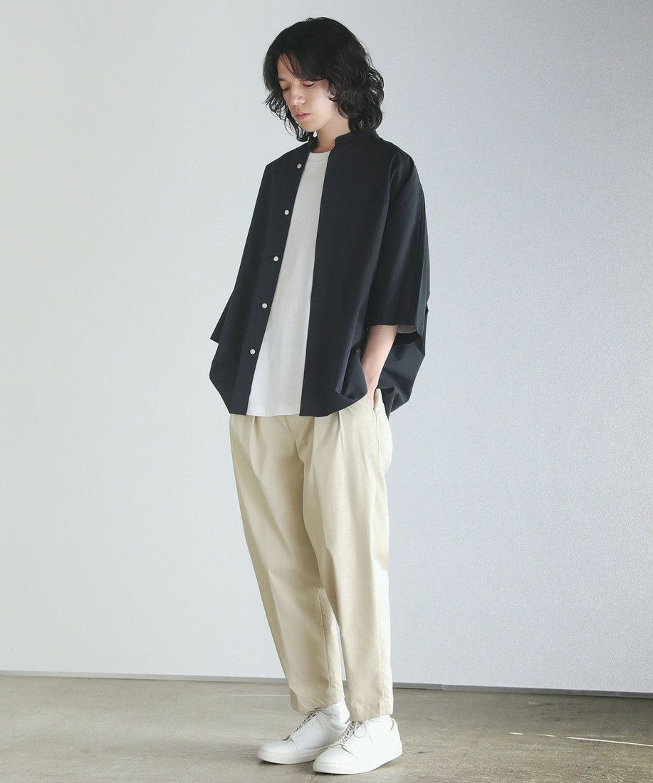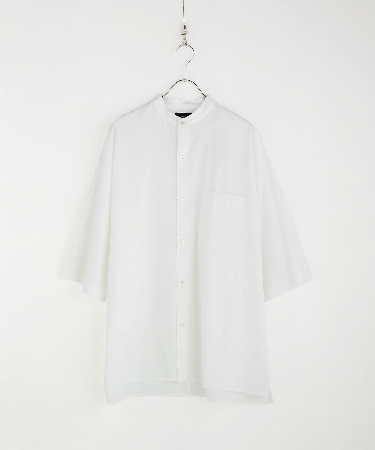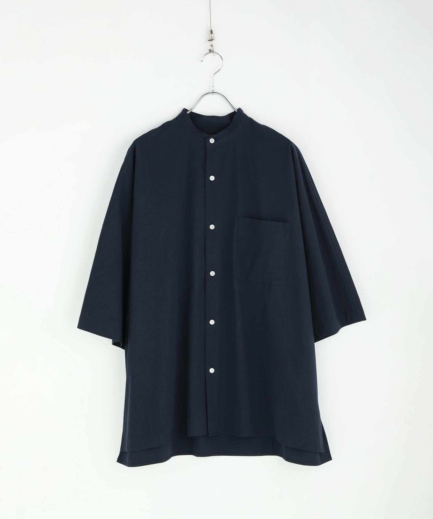 ヴィンテージ感のある独特な表情のポプリン生地を使用したドルマンスリーブシャツ。ソフトなふくらみ感と洗い晒しのようなヴィンテージライクなシワ感が特徴的です。特殊な染色技法で仕上げているため他にない柔らかな発色が魅力的で、上品な印象を与えます。上襟の無いすっきりとしたネックラインが特徴的なバンドカラーを採用し、清潔感のある一着に仕上げました。