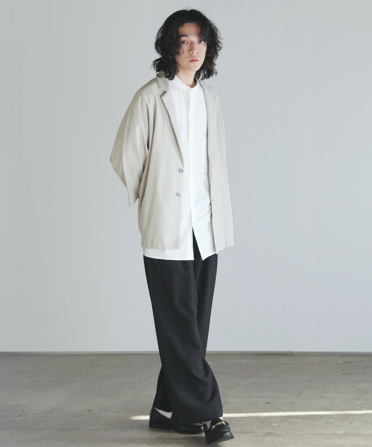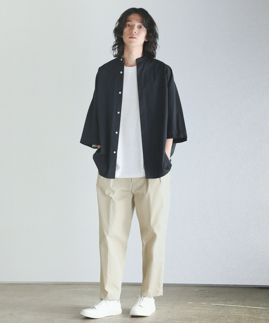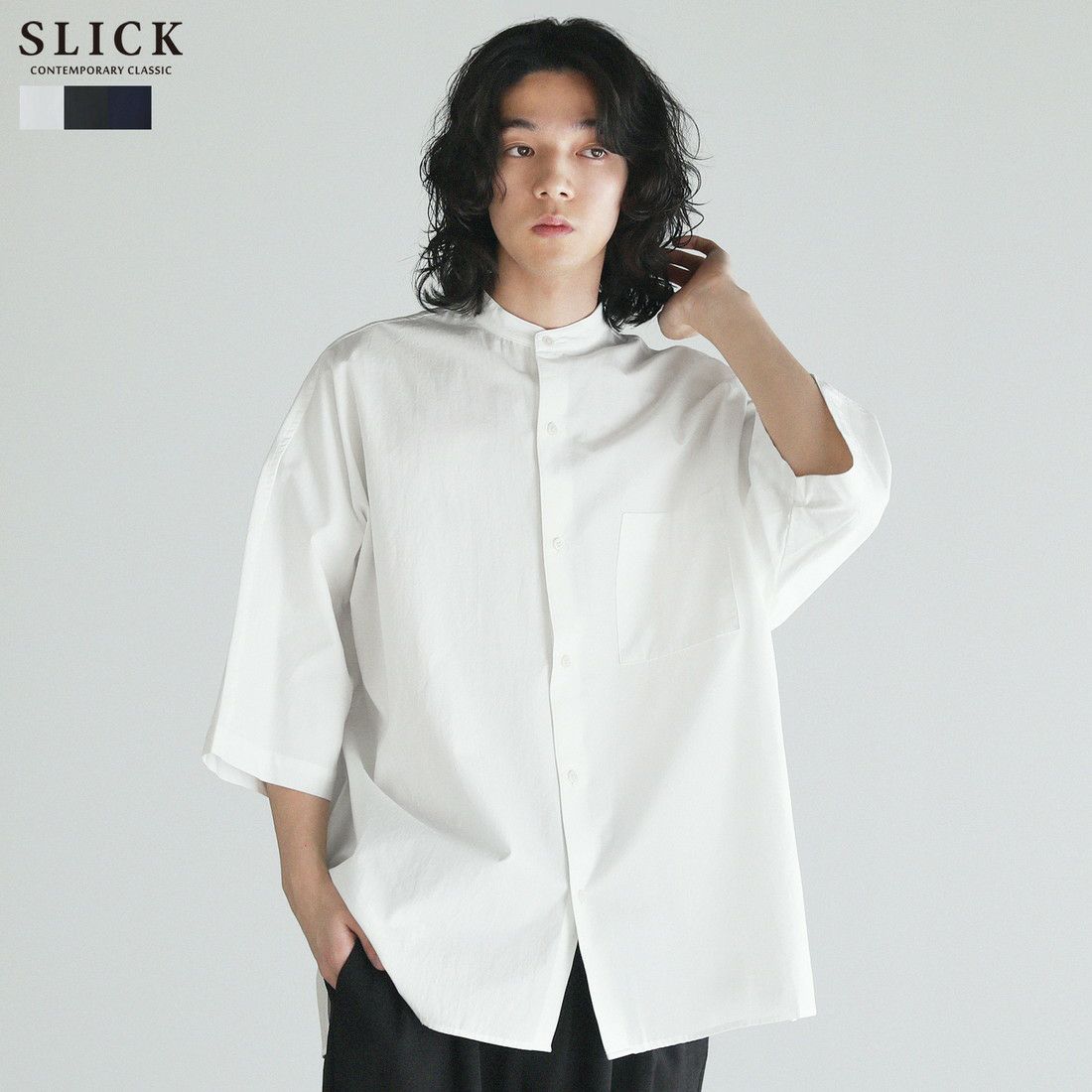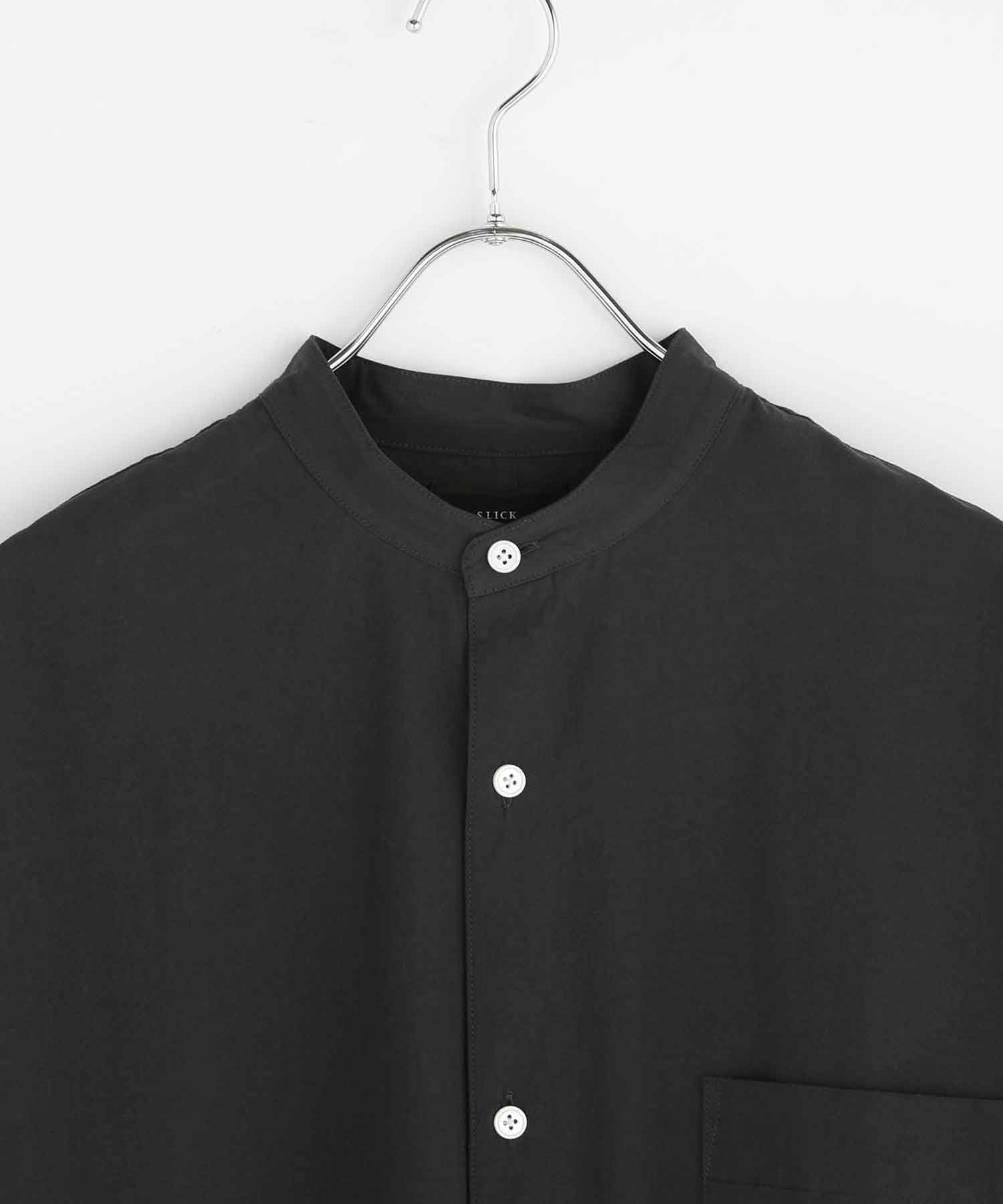 ヴィンテージ感のある独特な表情のポプリン生地を使用したドルマンスリーブシャツ。ソフトなふくらみ感と洗い晒しのようなヴィンテージライクなシワ感が特徴的です。特殊な染色技法で仕上げているため他にない柔らかな発色が魅力的で、上品な印象を与えます。上襟の無いすっきりとしたネックラインが特徴的なバンドカラーを採用し、清潔感のある一着に仕上げました。