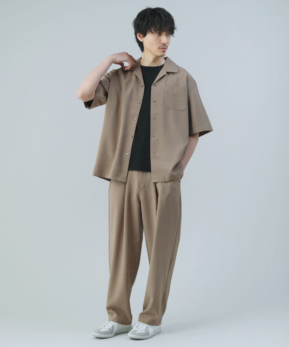 また、フロントにはタックを施しているため綺麗なシルエットが決まりやすく、リラックス感がありつつもきちんと品のある着こなしにしてくれます。シンプルなカットソーと合わせたラフなコーディネートはもちろん、同素材のアイテムと合わせたセットアップコーデもオススメ。オンオフ兼用で着用できる汎用性の高いアイテムです。