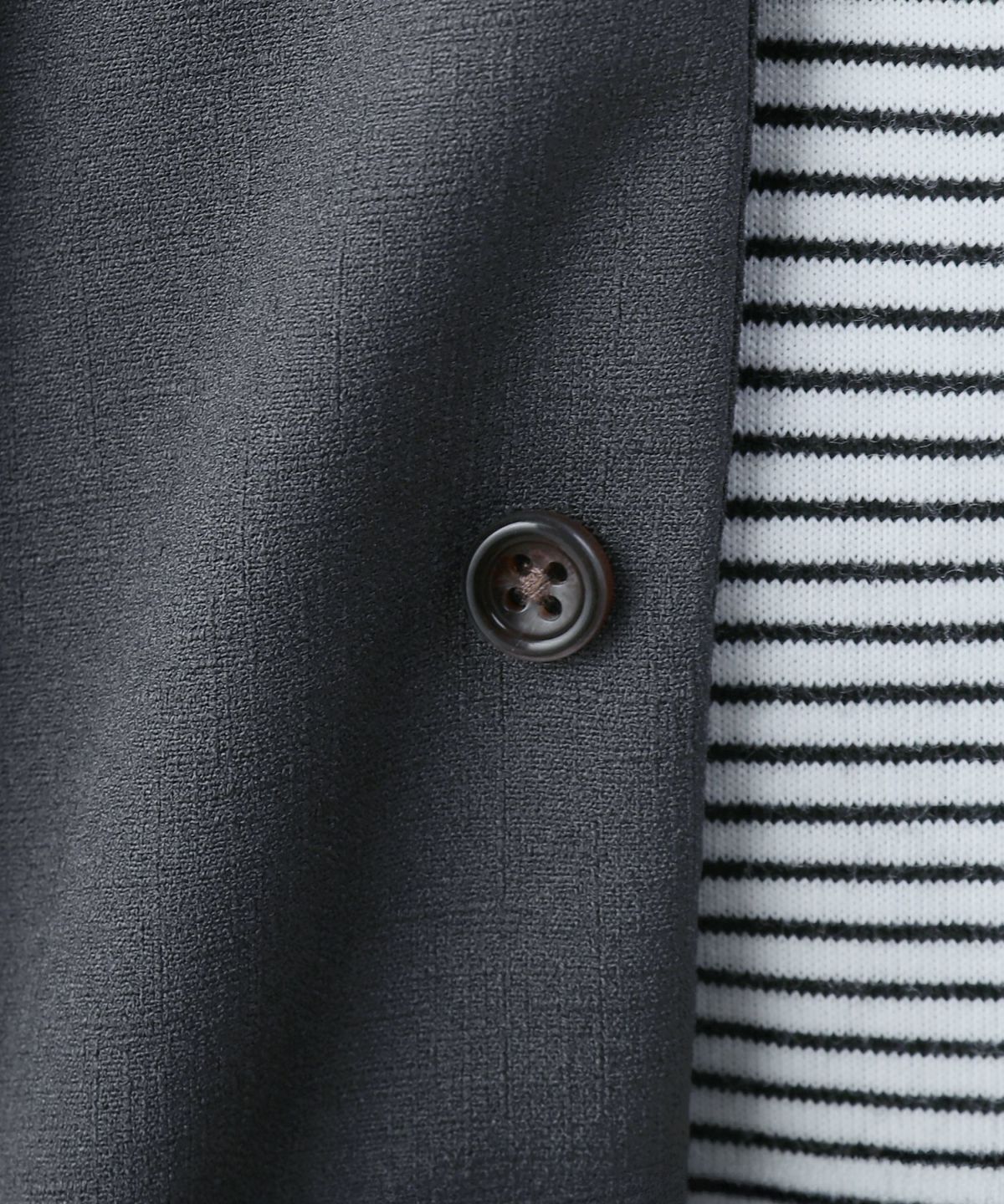 生地には、イージーケアで取り扱いやすいポリエステル素材を使用。表面に細かな凹凸があり肌に触れる面積が少ないため、ドライタッチで汗がべたつきにくいのもポイント。リネンのような表情ながら、ポリエステル100%素材のためチクチク感がなく、ご自宅での手洗い洗濯も可能です。適度なハリと軽さがありシワになりにくいので、デイリーに着まわせます。さらに、斜め方向への伸縮性も持たせているため着心地も抜群です。