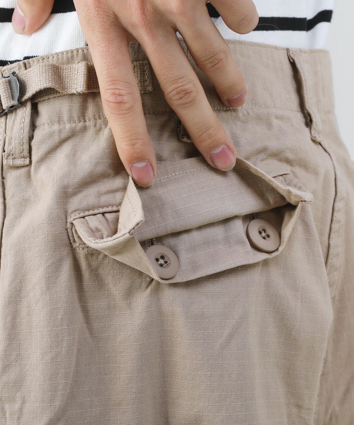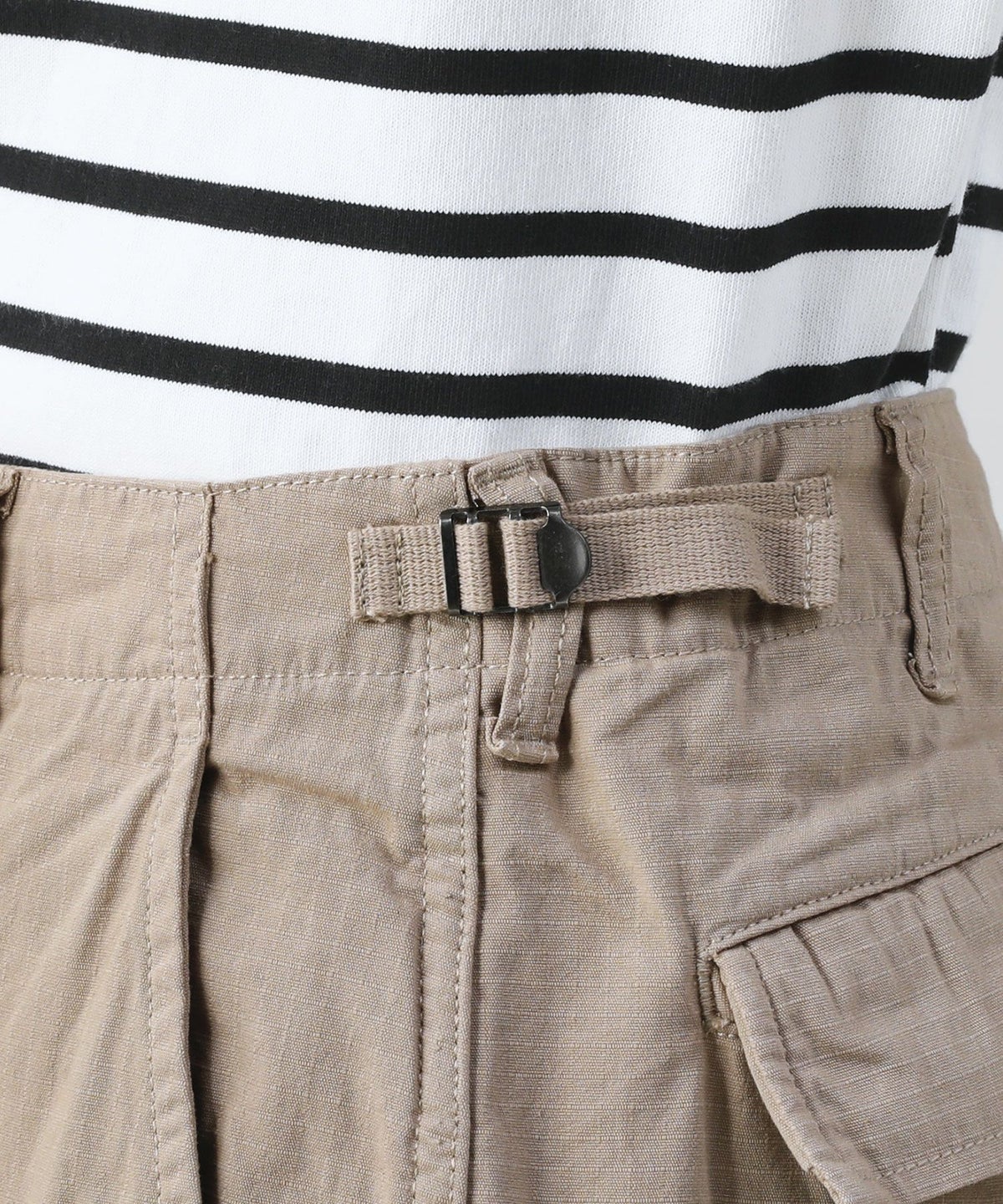 ディテール面にもさり気ないこだわりをプラス。フロント部分はジップではなく、シルエットをよりキレイに見せられるボタンフライ仕様を採用しています。ウエストにはサイズの微調整ができるよう、サイドアジャスターを取り付けました。両サイドには2つのポケットと2つのカーゴポケットを設置。ヒップにも2つのフラップ付きポケットがあり、合計6つのポケットを配しているため収納力も抜群です。