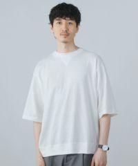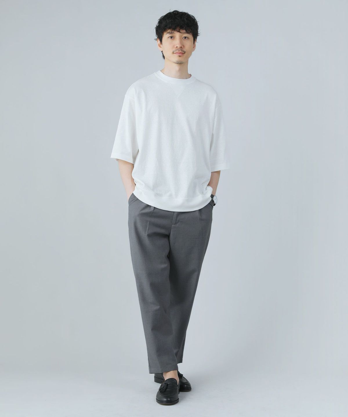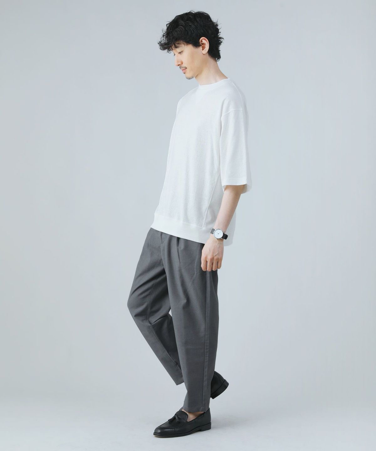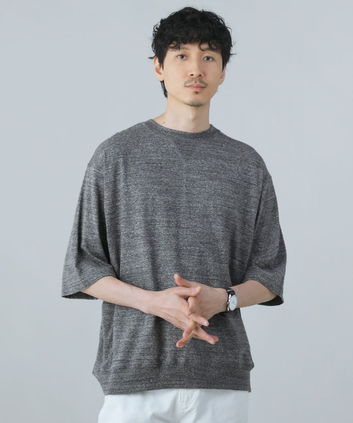カラーは、ベーシックで使い勝手の良いオフホワイト、ブラックに、糸染や生地染では表現できない杢調が魅力の杢チャコール、杢グレーを加えた4色展開。スラックスやワイドパンツなどキレイめにもカジュアルにも合わせやすく、簡単にラフな大人コーデが完成します。スウェットライクなデザインがこなれ感を与えてくれる、一枚着でもサマになるアイテムです。