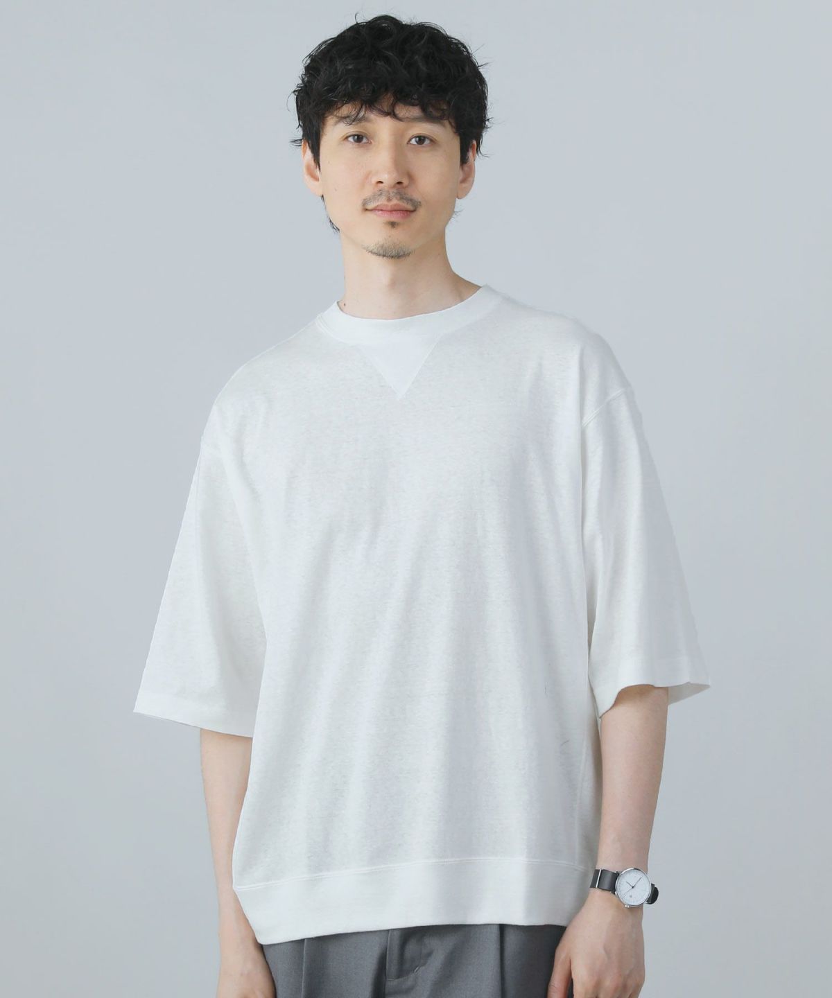 サイズ感はやや大きめに仕上げており、肩の落ちたドロップショルダーと広めに身幅を取ったデザインが今っぽい印象をプラス。袖はゆとりのあるサイズ感に合わせて長めの丈感に設定しており、春先から晩夏まで長い期間ご着用いただけます。首元のV字ガゼット、襟ぐりや裾に配したリブなど、スウェットのディテールを落とし込んだデザインにもこだわりました。