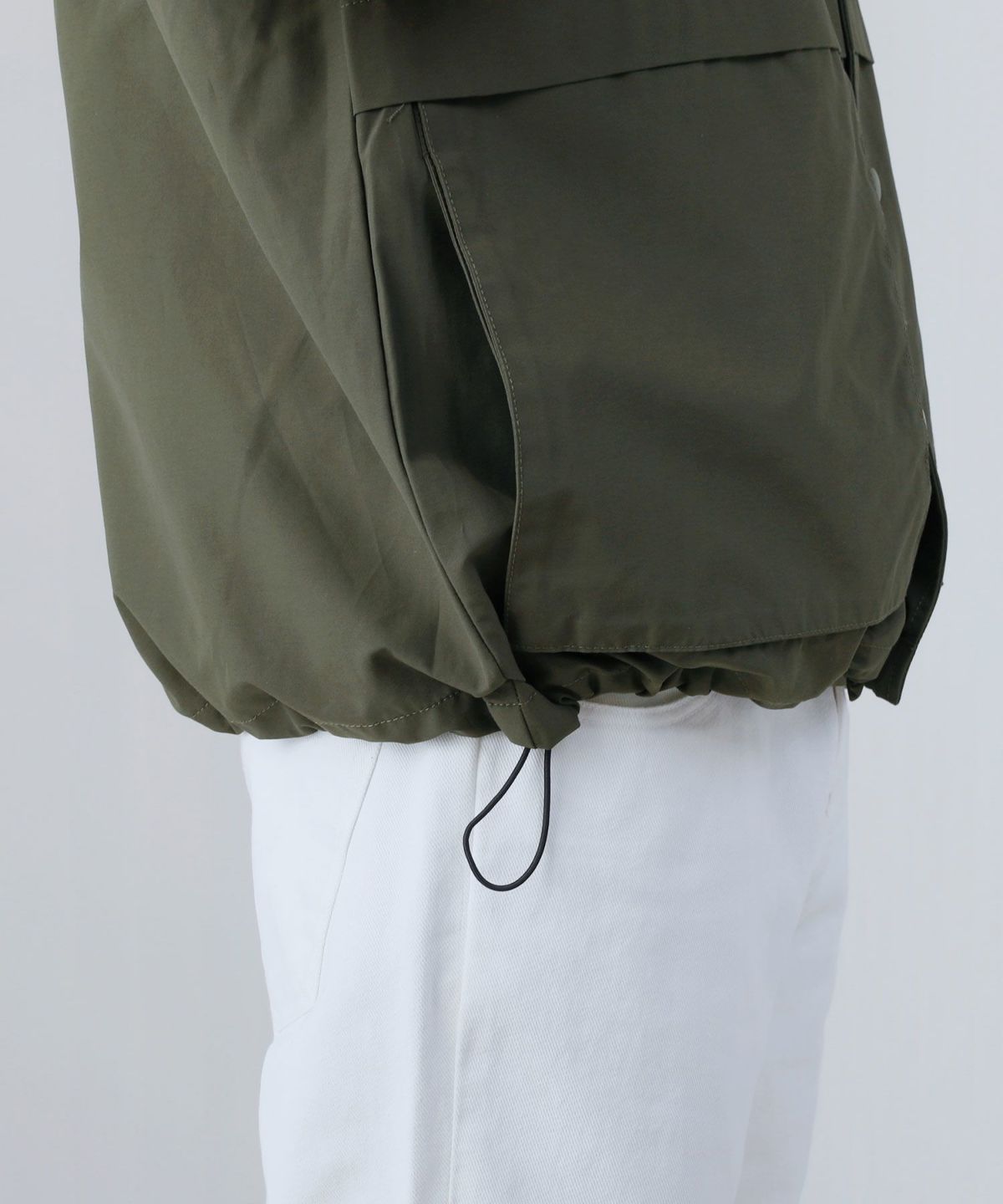 大きなフラップポケットはサイドも大容量ポケットとなっており、機能面も抜群。バックのマジックテープの中はメッシュ生地を張ったベンチレーションとなっており、夏場でも蒸れにくく快適にご着用いただけます。裾にはドローコードが付いており、絞って着用すると丸みのあるシルエットに変化し、こなれ感のある着こなしを演出してくれます。