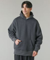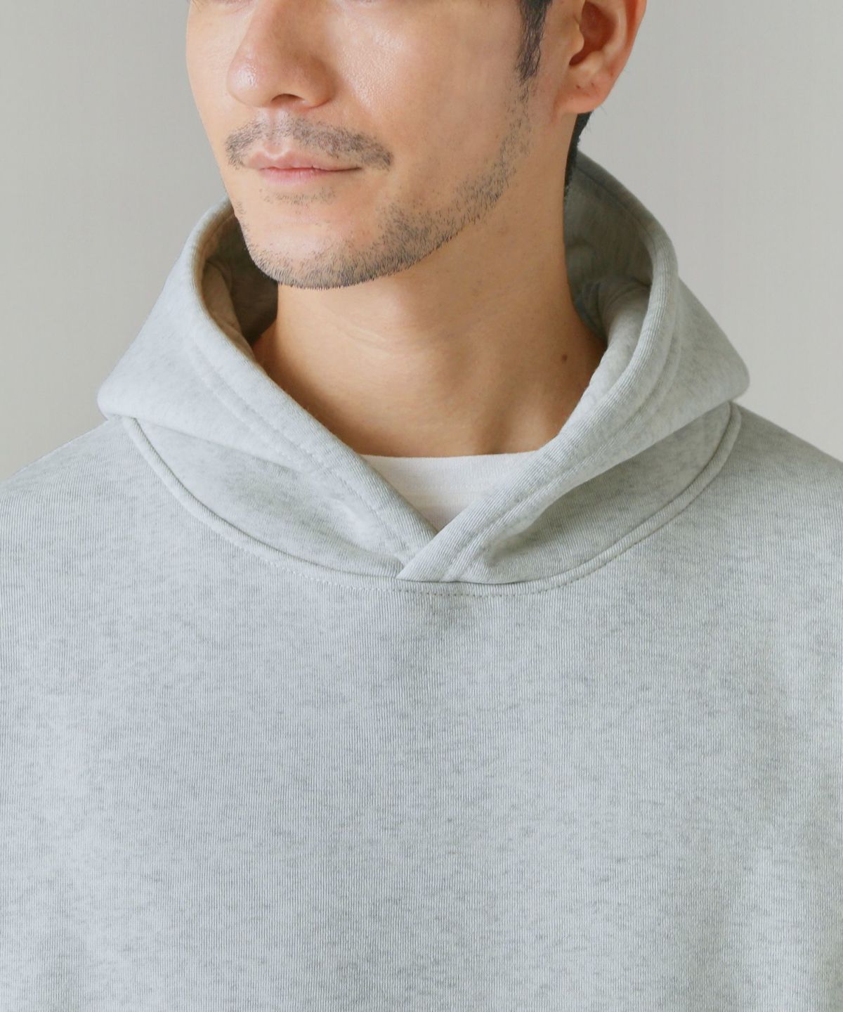 しっかりと厚みのあるヘビーウェイト生地ではありますが、通常のスウェット生地よりも柔らかく、伸縮性にも優れているのが特長。ふわふわの裏起毛によって暖かい空気が衣服内に保たれ、確かな保温性を発揮します。また滑らかで柔らかい生地感によって、袖通しの良いリラックスした着心地を実現しました。