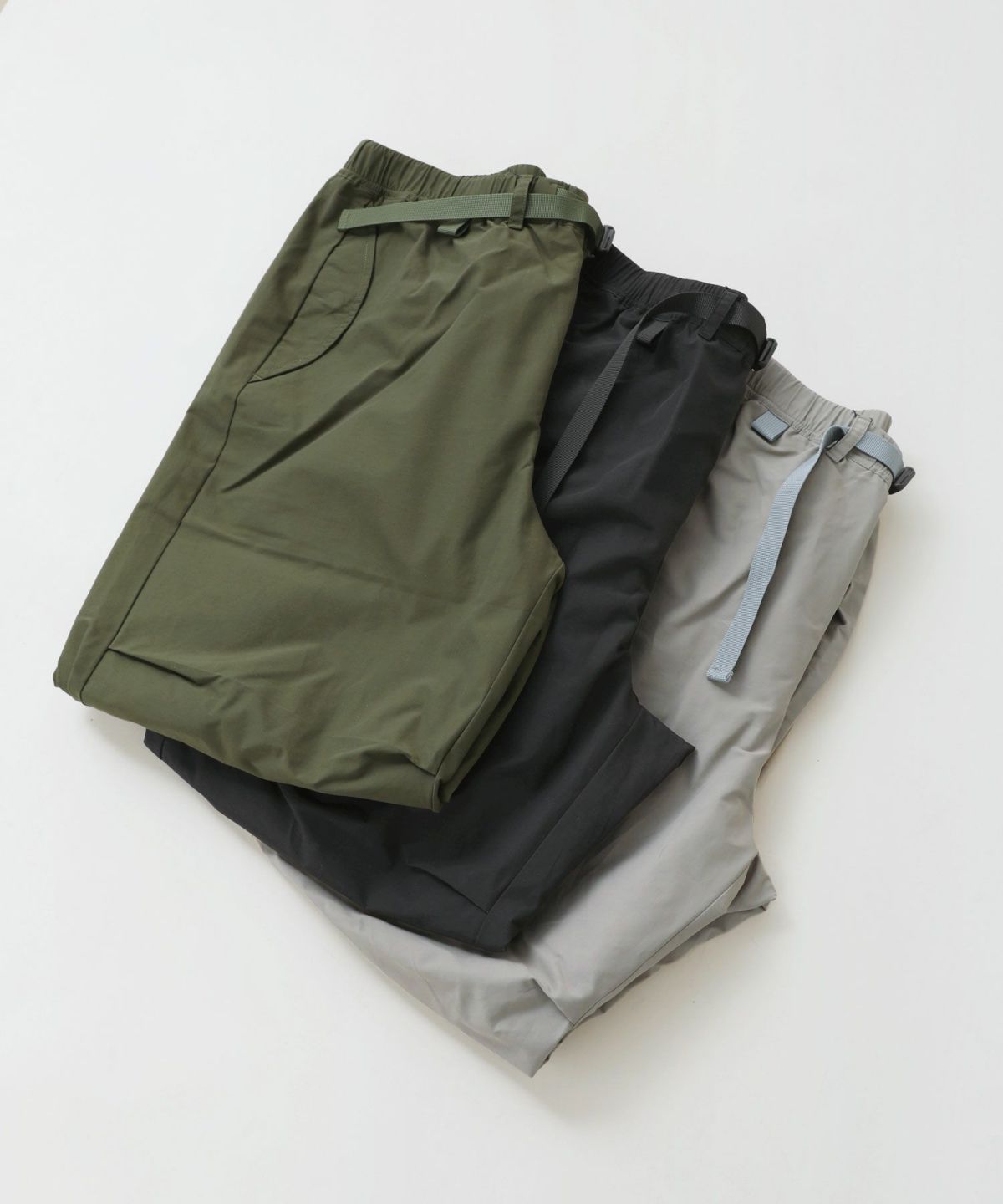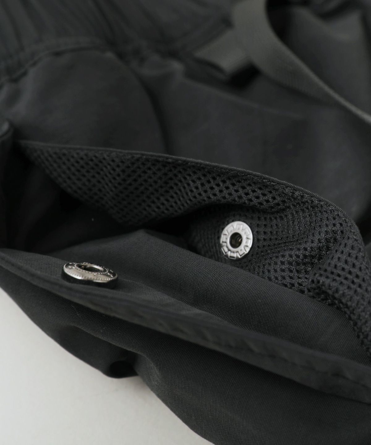 裏面は総メッシュ生地になっており、汗をかいたときなどに生地が肌に張り付いてしまうのを防いでくれます。ポケットにはスナップボタン付のフラップやポケット口のファスナーを取り付け、中に入れたものが落ちてしまわないようなつくりにしました。ウエストはゴムウエストなだけでなく、細かな調節を可能にするグログランテープベルトも付けています。随所に機能面を考慮したディテールが光るパンツです。裾にドローコードも付けているので、絞ってシルエットを変化させての着回しもお楽しみいただけます。