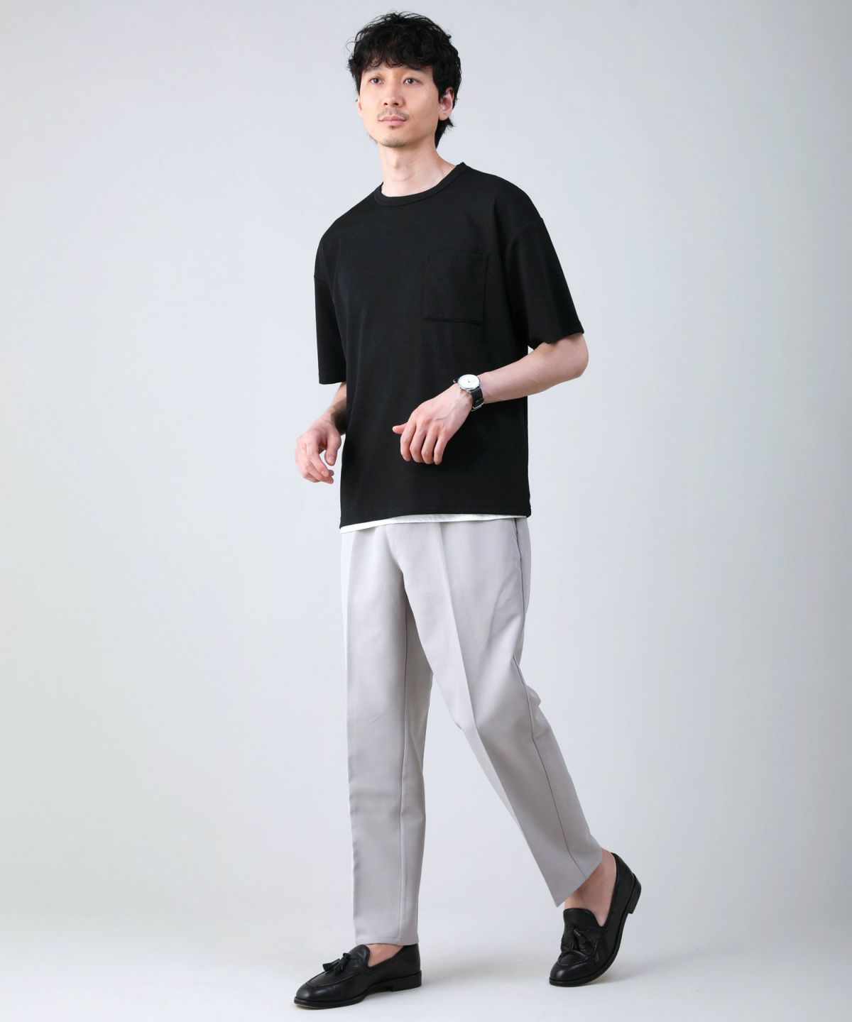 シンプルなデザインなので、どんな着こなしにも合わせられますが、オススメはスラックスやチノパンと合わせた大人っぽいスタイル。ミニマルなデザインと上質な生地感がシンプルながらもワンランク上の風格を出してくれます。