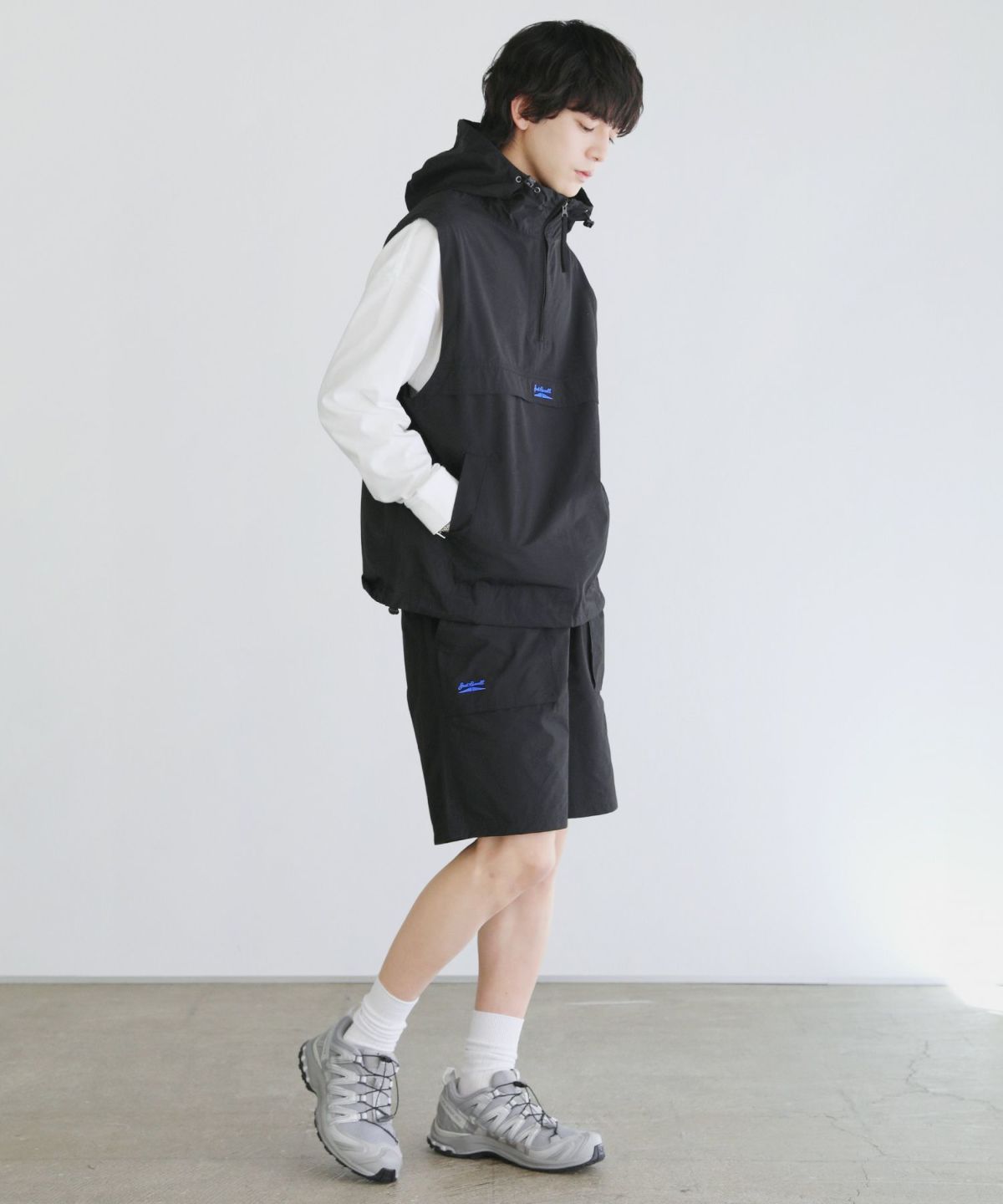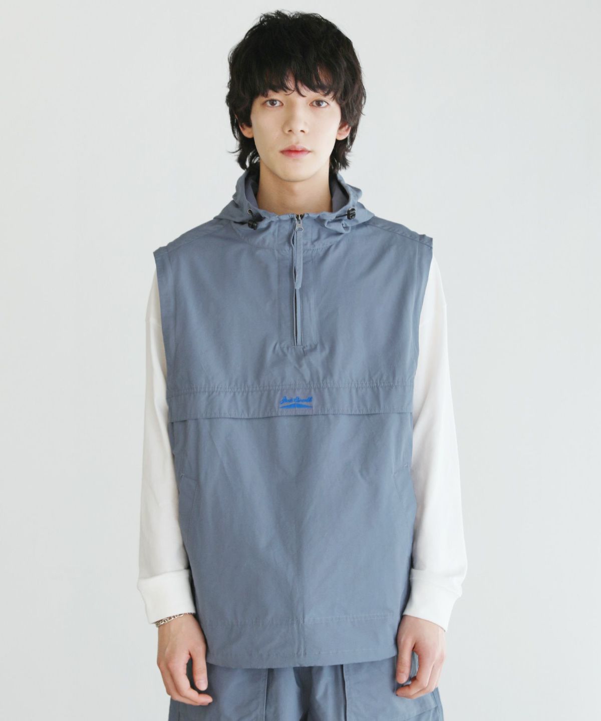 身幅やアームホールはゆとりのあるオーバーサイズで、インナーを選ばす気軽にレイヤードしやすくなっています。袖を取り外せる2WAY仕様でベストとしても着用でき、幅広い着こなしが可能に。また、フードと裾に設置されたドローコードを絞ると、シルエットの変化に加えて風によるバタつきや冷気の侵入を防いで防寒力を高めることもできます。