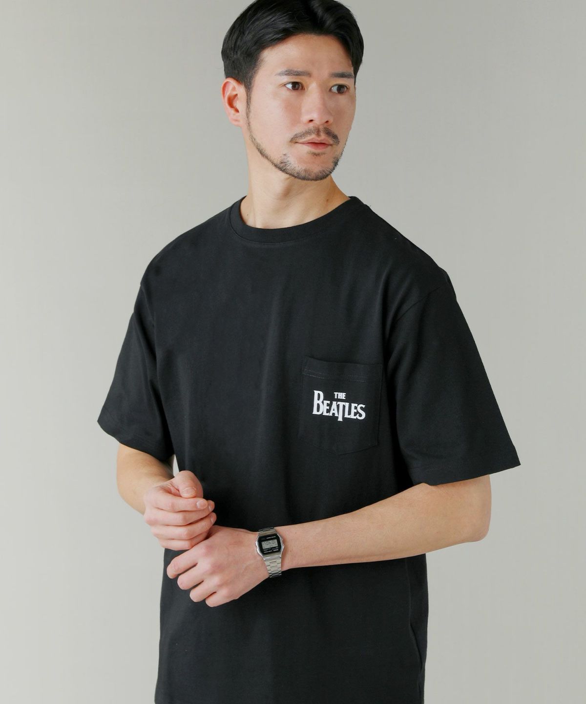 世界的人気のイギリスのロックバンド『The Beatles』のバンドロゴをプリントしたTシャツです。 胸ポケットとバンドロゴがデザインのアクセントになり、シンプルで着回しやすいアイテムに仕上げました。 モノトーンのため、インパクトがありながらも着こなしやすい一着です。