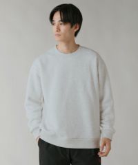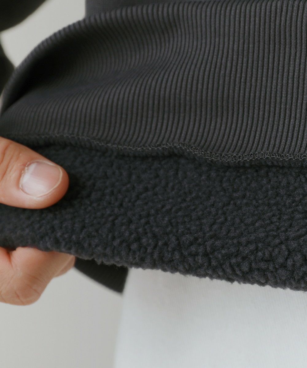 表面は通常のスウェット生地の見た目でありながら裏面はモコモコのボア状になっている、裏ボアスウェット生地を用いました。ボアによって内側に空気の層が作られ、暖かさが維持されます。ポリエステル100%なのでボアの厚みに反して軽量で、楽に着続けられる生地です。同素材で、ライトアウターとしても活躍する ジップアップパーカー もご用意しております。