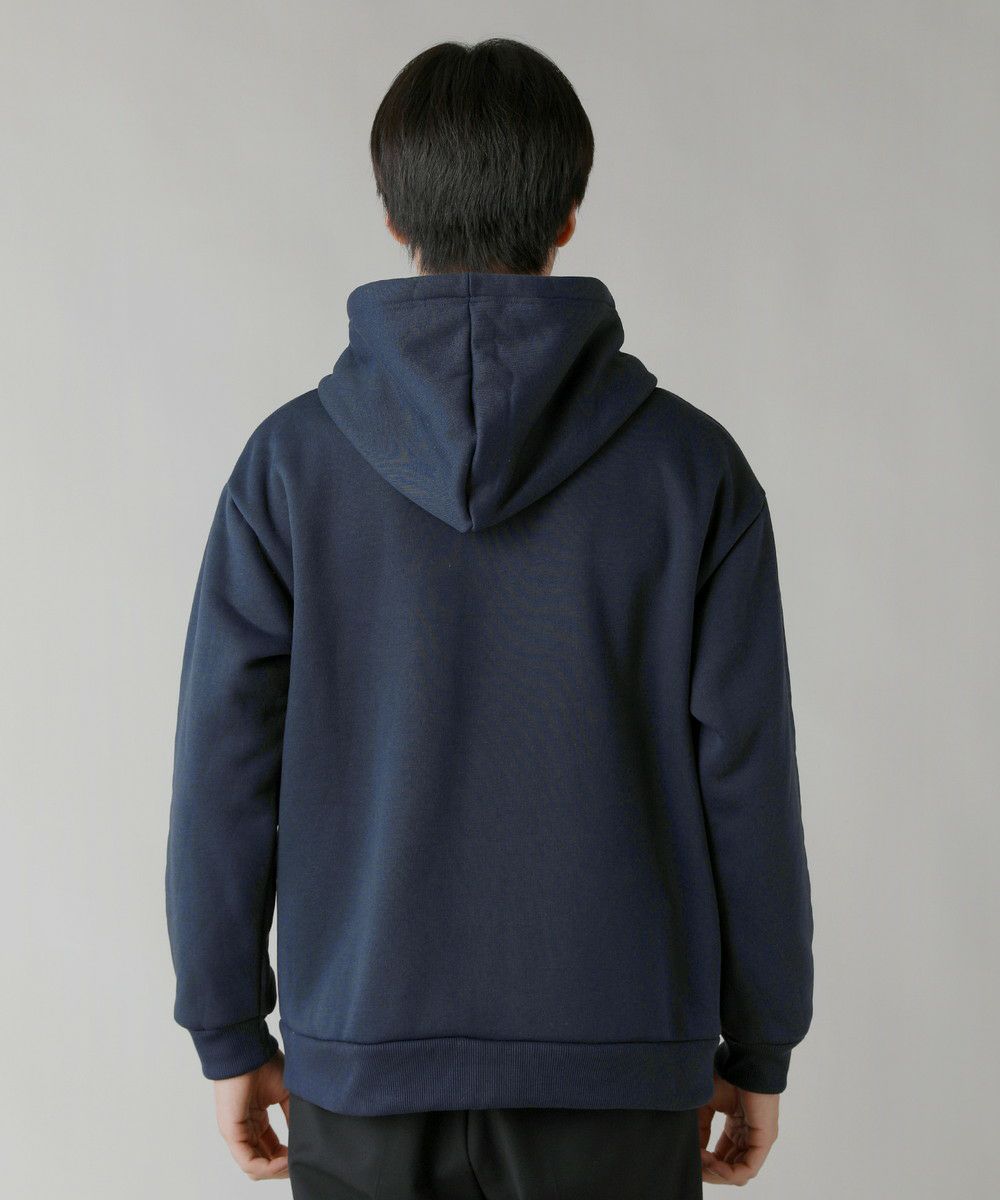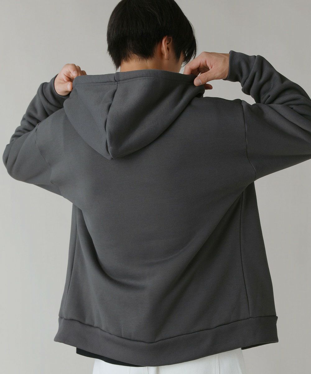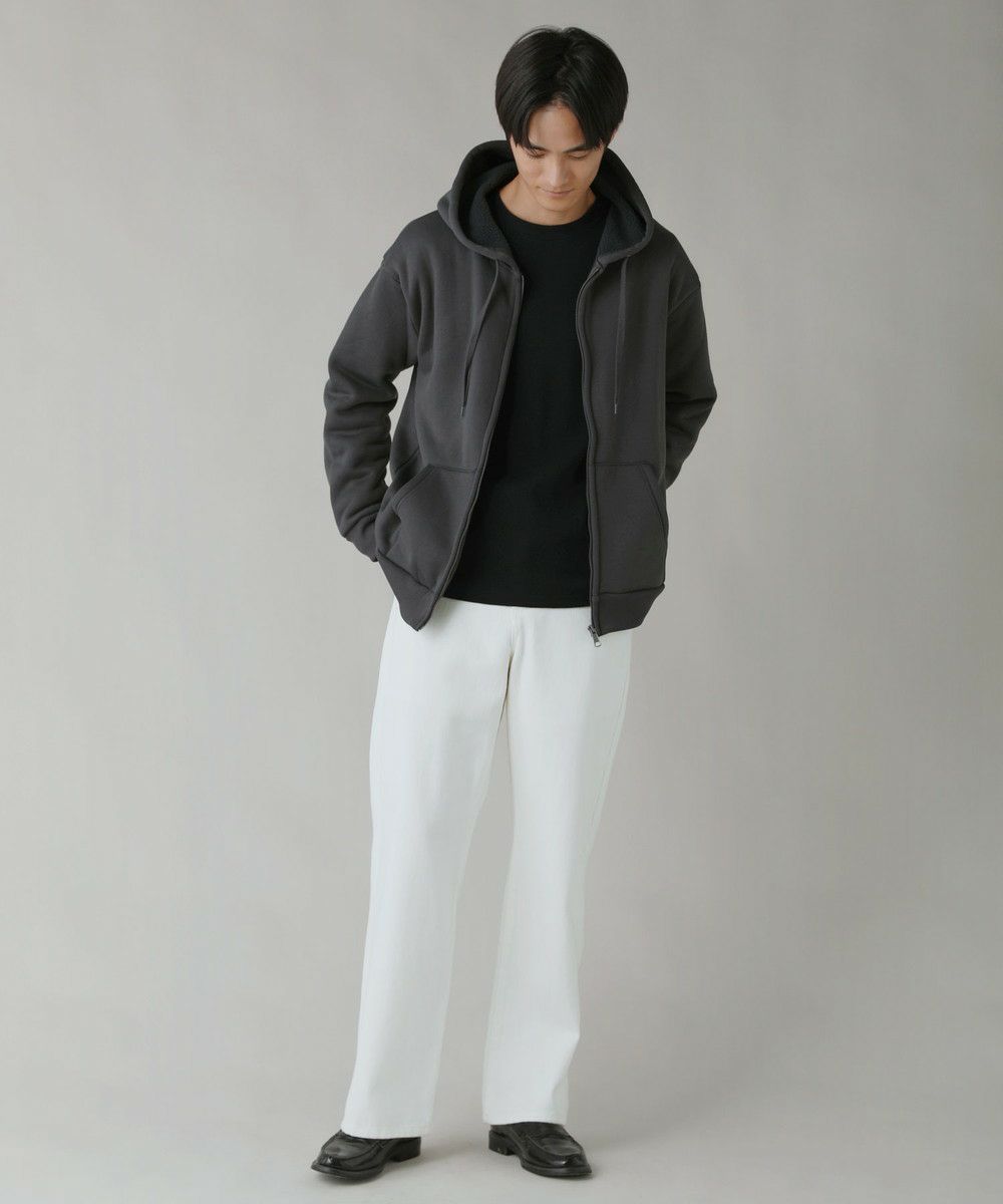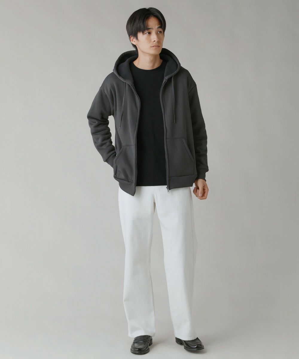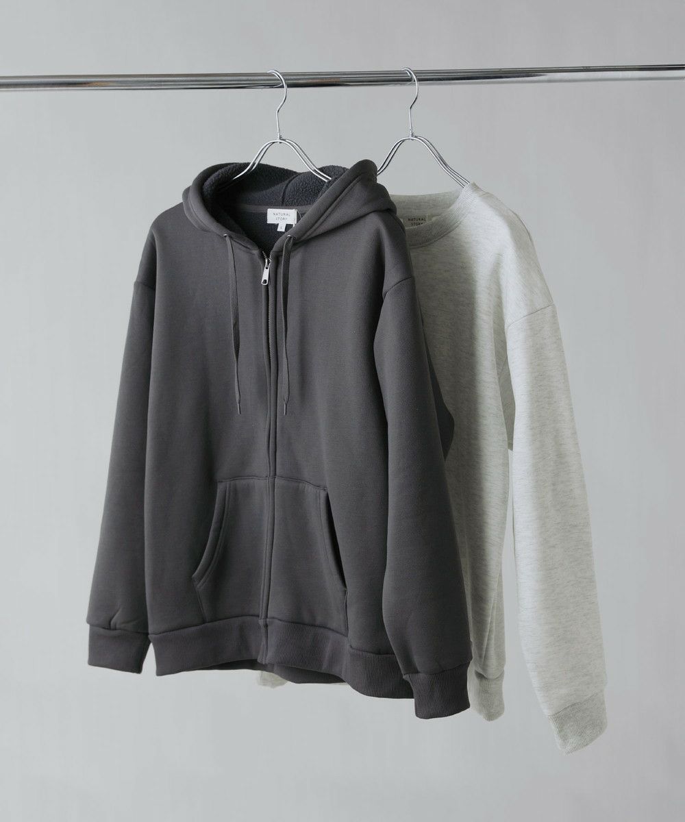 表面は通常のスウェット生地の見た目でありながら裏面はモコモコのボア状になっている、裏ボアスウェット生地を用いました。ボアによって内側に空気の層が作られ、暖かさが維持されます。ポリエステル100%なのでボアの厚みに反して軽量で、楽に着続けられる生地です。同素材で、デイリーユースに適した